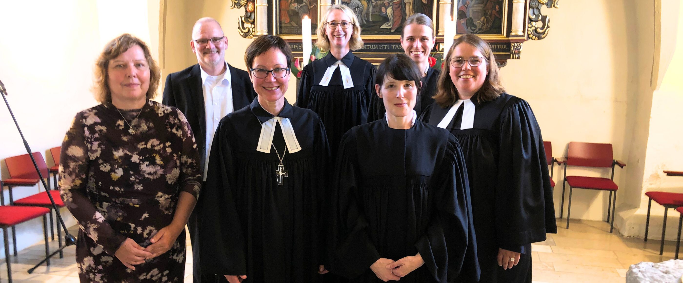 Mit den vier Assistierenden ordinierte Regionalbischöfin Ruck-Schröder die neue Pastorin mit Handauflegen und Segen. Alexandra Beiße und Tabea Speisekorn, Weggefährtinnen aus Franziska Edes Vikariat, waren dazu gekommen, Peter Porzig, Kollege und Freund aus ihrer Zeit an der Universität in Göttingen, und Annette Worms, Vorsitzende des Kirchenvorstands Uschlag. Marit Günther, Superintendentin im Evangelisch-lutherischen Kirchenkreis Göttingen-Münden, verlas die Urkunde.