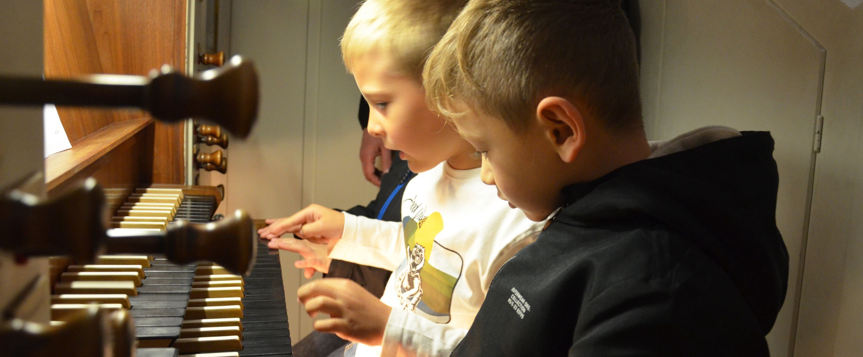 Auf der Orgelempore dürfen die Kinder verschiedene Pfeifen in die Hand nehmen und Arne Hallmann führt ihnen vor, wie große und kleine, Holz- und Metallpfeifen klingen. Selbst hineinpusten dürfen die Mädchen und Jungen nicht: „Wir wollen ja nicht alle morgen einen Schnupfen haben“, so der Kantor. Und er erzählt, dass die Pfeifen neben Zink auch Blei enthalten: „Deshalb sind Orgelbauer früher nicht sehr alt geworden – sie mussten ja immer wieder in die Pfeifen pusten, um sie zu testen.“