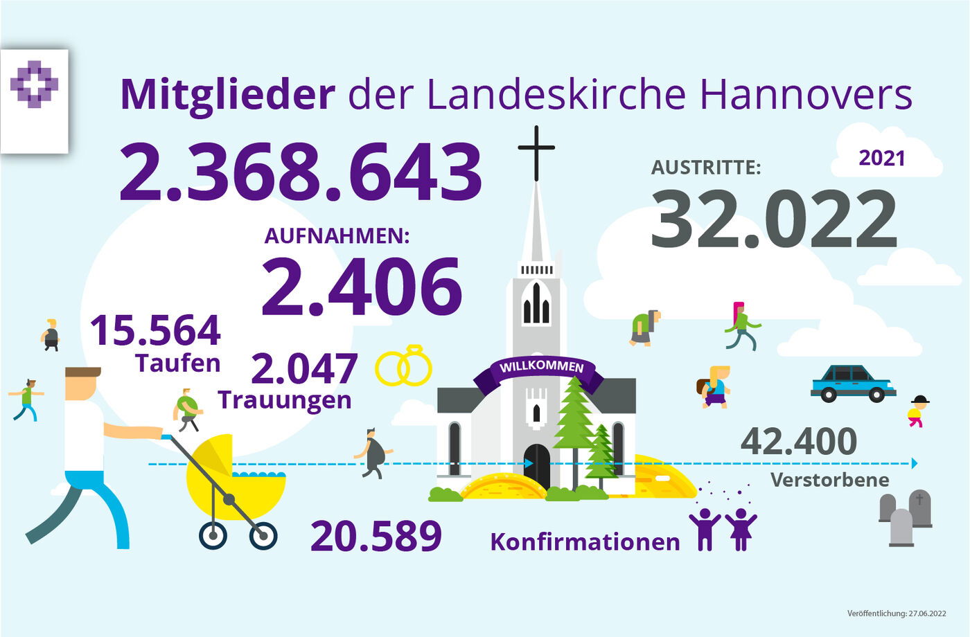 Sechs Sprengel, 47 Kirchenkreise, mehr als 1200 Kirchengemeinden – das sind rund 165.000 Menschen in Ehrenamt und Beruf. Sie engagieren sich in Kirchen und Gemeindehäusern, in der Zivilgesellschaft und in diakonischen Einrichtungen, in Kirchenämtern, auf Friedhöfen und in Kindertagesstätten, in der Hauswirtschaft und Organisation. Mit allen Christinnen und Christen sind und leben wir: Kirche.