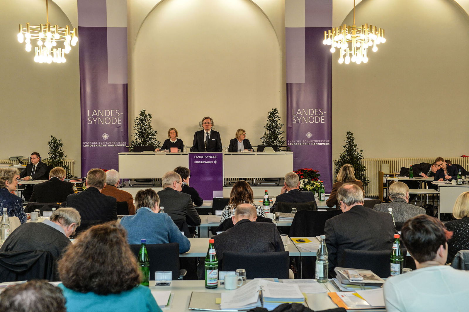 Mit einem herzlichen Dank an Landesbischof Ralf Meister, den geistlichen Vizepräsidenten Arend de Vries und Silvia Mustert, persönliche Referentin des Landesbischofs, für die Gestaltung des Eröffnungsgottesdienstes in der Kirche der Henriettenstiftung eröffnete Synoden-Präsident Dr. Matthias Kannengießer die VII. Tagung der 25. Landessynode. Zu ungewohnter Zeit, am Dienstagmorgen, beginne diese Tagung, so Kannengießer, dies hänge mit einer Premiere zusammen: Zum ersten Mal tagt die Synode einen Tag lang am anderen Ort, im Rathaus des Westfälischen Friedens in Osnabrück. „Wir dürfen uns auf das freuen, was uns in Osnabrück erwartet“, stellte Kannengießer fest und sprach allen, die die Reise des Kirchenparlaments vorbereitet hatten, seinen Dank aus.