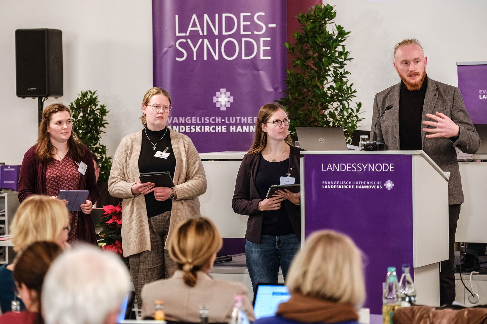 Die Synodalen Torben Salm, Silke Kahmann und Kea Irmer (beide Sprengel Ostfriesland-Ems) sowie Antonia Potempa (Sprengel Stade) stellten gemeinsam Anträge vor, die aus den Ergebnissen der Jugendsynode entwickelt worden waren. Sie befassten sich vor allem mit Fragen von inklusiver Kommunikation, Aufbau, Funktion und Organisation von Entscheidungsstrukturen sowie der Gremienarbeit in der Landeskirche. Außerdem ging es um Kostenausstattung für Ehrenamtliche, flächendeckendes W-Lan in Gemeindehäusern, die Ermöglichung digitaler Treffen und Sitzungen sowie Standards für Inklusion. In diesem Zusammenhang stellte der Synodale Dr. Johannes Nikodemus Keymling (Sprengel Hannover) die Frage nach einem Gebärdendolmetscher für die Synodensitzungen.