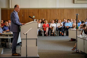 Mit der Verpflichtung eines neuen Mitglieds hat der Präsident der Landessynode, Dr. Matthias Kann...