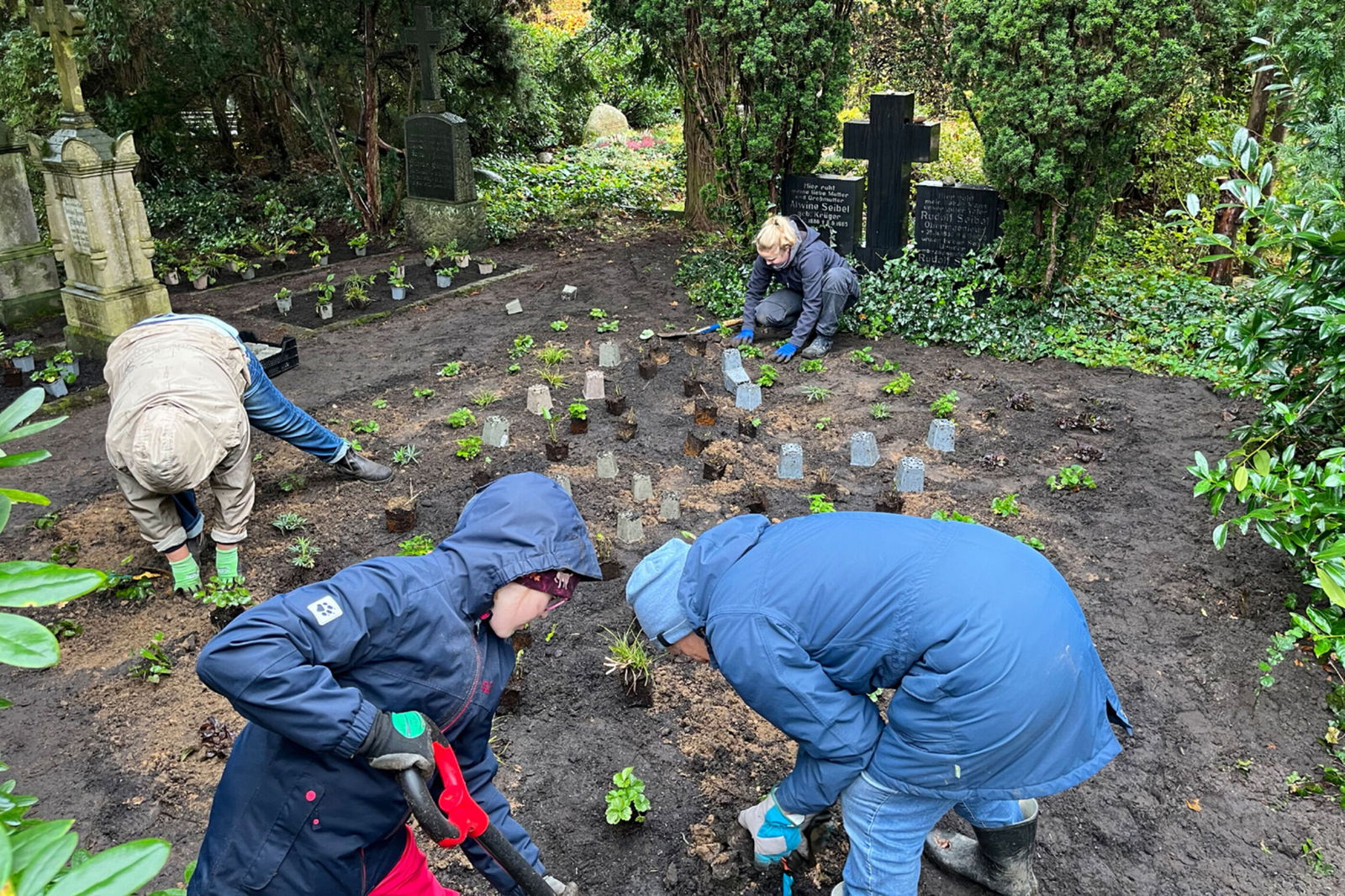 Die Johanniskirchengemeinde, die mit Kirchenvorstands-Mitgliedern aktiv an den Arbeiten beteiligt war, hatte für einen Imbiss und warme Getränke unter dem Dach des Geräteraums gesorgt. Nach gut fünf Stunden war das Gros der Aufgaben erledigt, die restlichen Gehölze wurden in den folgenden Tagen vom Friedhofsteam gepflanzt.
