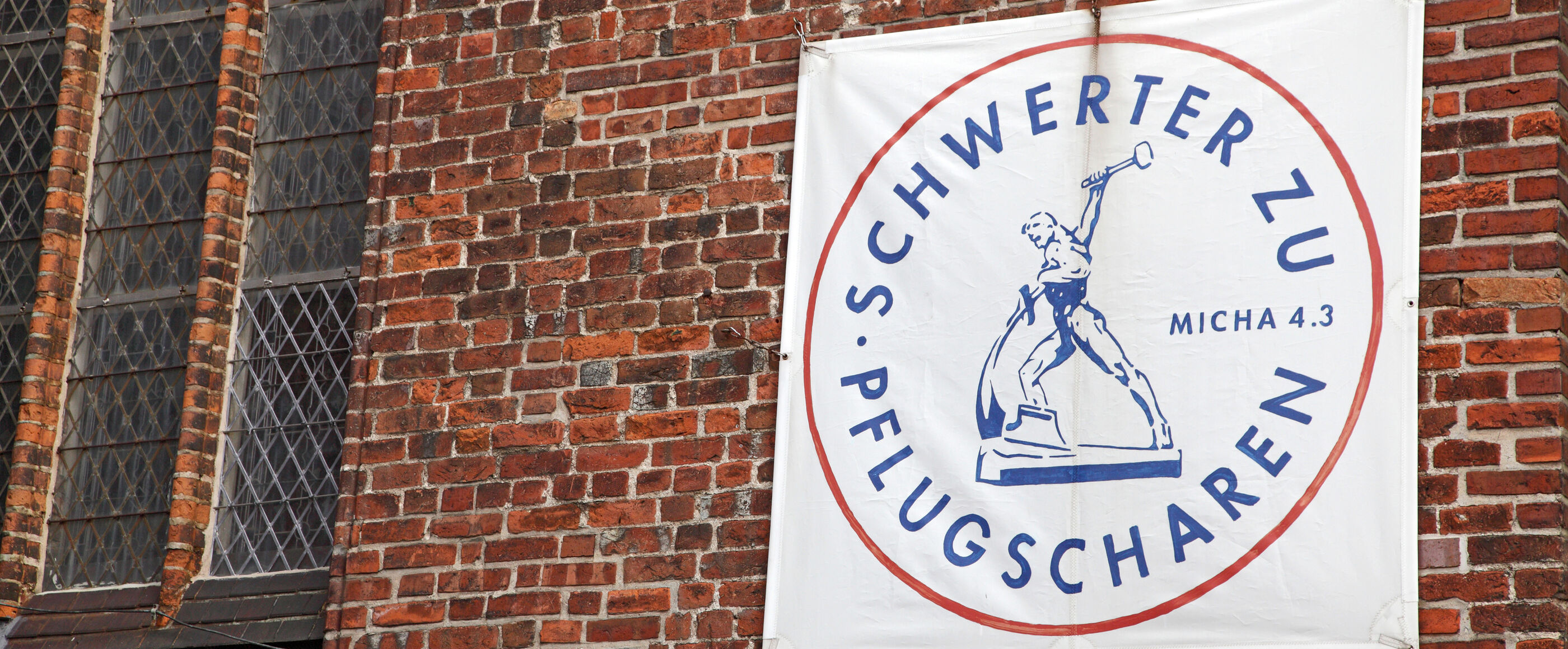 Der sowjetische Bildhauer Ewgenij Viktorowitsch Wutschetitsch hat ein Denkmal geschaffen, das 1957 Russland der UNO schenkte. Die Friedensbewegung in der DDR machte dieses Denkmal zu Ihrem Logo. Ende der 70er. Mit dem Zitat aus dem Buch des Propheten Micha „Schwerter zu Pflugscharen“ steht es für eine Utopie. Sie träumt von einer Welt, die anders ist als die, die wir erleben. Sie verweist darauf, sich nicht mit der erlebten Realität abzufinden.