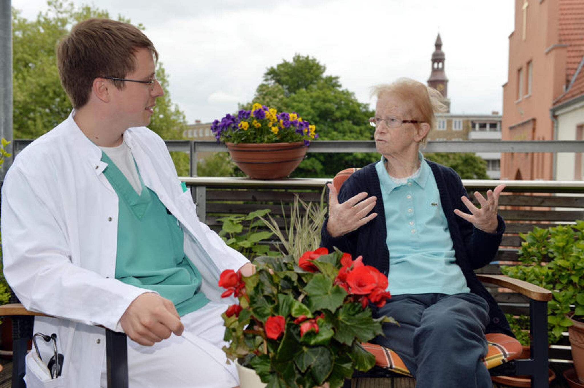 Junger Arzt im Gespraech mit einer Patientin am 21.05.15 auf der Terasse der Palliativstation im Friederikenstift in Hannover. Bild: epd-bild/Jens Schulze