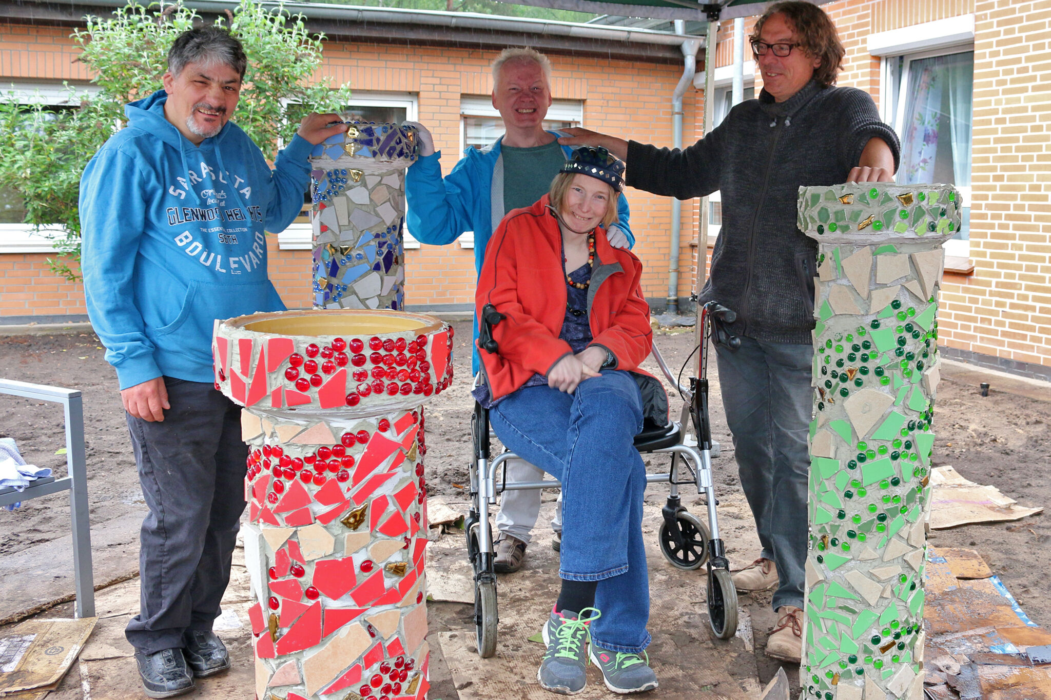 60 cm tief stecken die Säulen in einem Beton-Fundament, das der Hausmeister „perfekt vorbereitet hatte“, so Zühlke. Die Gestaltung der Außenfassade der Säulen war dann ganz in den Händen der Menschen mit Behinderung. Um ein Mosaik zu erzeugen, wurden alte Fliesen zerkleinert und „Glasmurmeln“, wie ein Helfer die kleinen gläsernen Objekte nennt, vorbereitet. Dazu kamen einige wenige goldfarbene Plättchen. Anschließend wurden die Einzelteile liebevoll angeklebt.