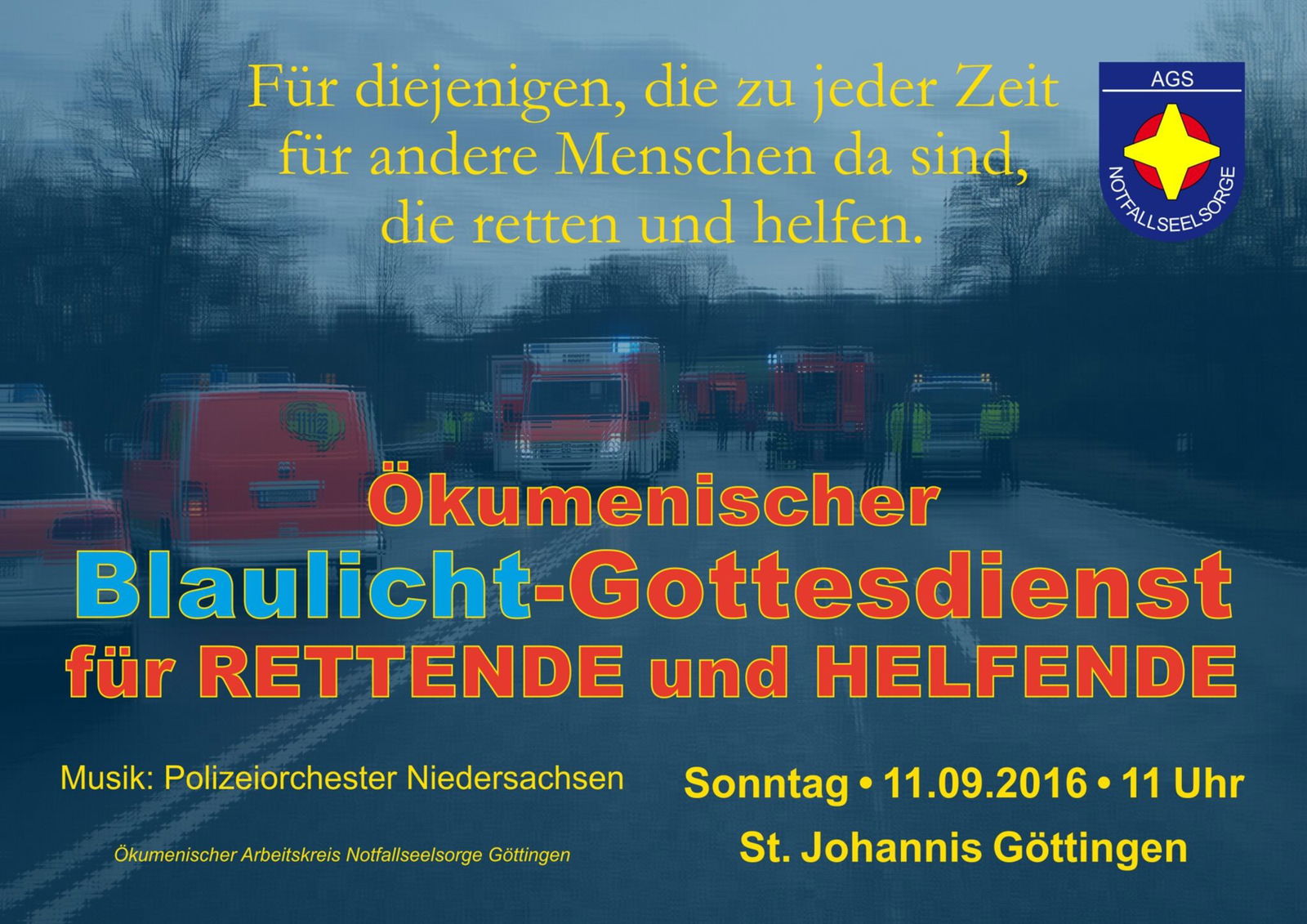 Am darauffolgenden Sonntag ist um 11 Uhr in der St. Johanniskirche in Göttingen der Ökumenische Blaulicht-Gottesdienst. Eingeladen sind hierzu alle Engagierten der Rettungsdienste, berufstätige und freiwillige Feuerwehrfrauen und Feuerwehrmänner, Polizistinnen und Polizisten und Notfallseelsorgende. Um diesen Menschen zu danken, hat der ökumenische Arbeitskreis Notfallseelsorge Göttingen diesen Gottesdienst vorbereitet. Die Rettenden und Helfenden übernehmen in der Stadt und dem Landkreis Göttingen eine wichtige Aufgabe. Sie sind selbstlos und zu jeder Zeit für Menschen aktiv, die sich in einer akuten Notlage befinden.