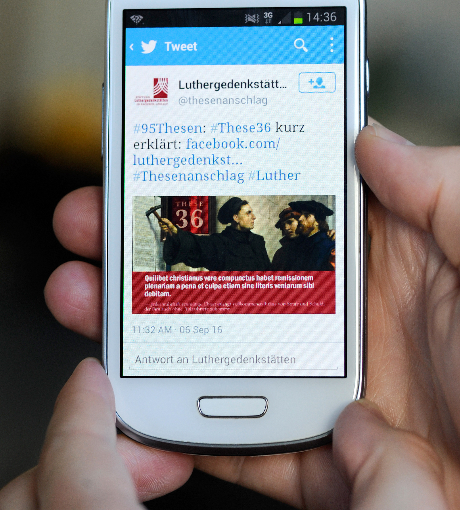 Einige wenige Beispiele - kirchliche wie säkulare - für Internet-Aktivitäten gibt es dennoch: #95Thesen arbeitet auf Twitter direkt mit dem Erbe Luthers: «Man spricht immer von Luthers 95 Thesen, weiß aber eigentlich gar nicht was das ist», sagt Andrea Fußstetter von der Stiftung Luthergedenkstätten in Sachsen-Anhalt. Auf Facebook und Twitter stelle man jede Woche eine These vor, 95 Wochen lang.