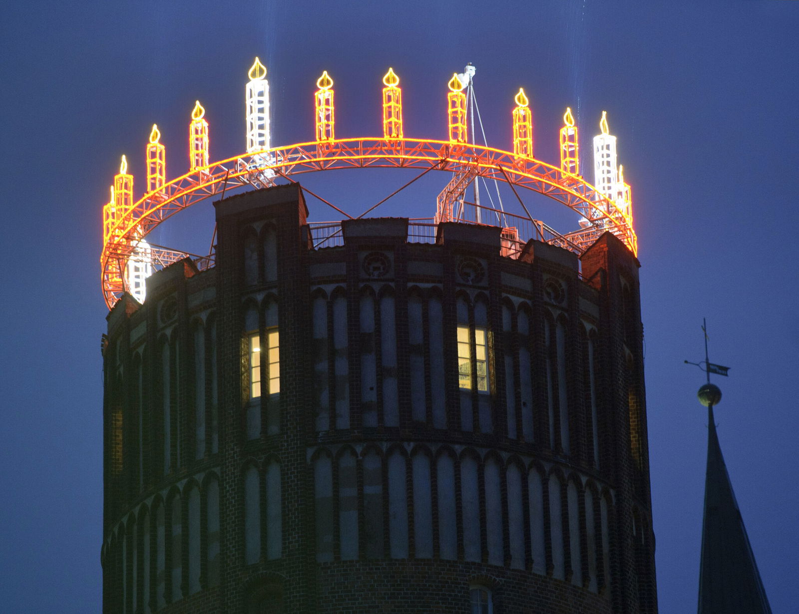 Der Adventskranz wird zum neunten Mal oberhalb der Zinnen des Wasserturms von 1907 installiert. Nach Angaben der Initiatoren sind in den vergangenen Jahren insgesamt mehr als 41.400 Euro für Hilfsprojekte zusammengekommen. Die Aktion erinnert an den Erfinder des Adventskranzes, den Hamburger Theologen Johann Hinrich Wichern (1808-1881). Wichern ließ 1839 in dem von ihm gegründeten "Rauhen Haus", einem Heim für verwahrloste Jugendliche, erstmals einen großen hölzernen Adventskranz aufhängen.