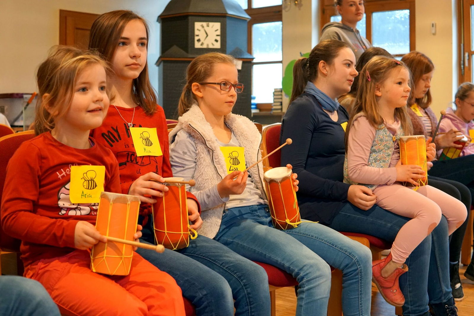 Auch was auf Slowenisch „Guten Tag“ heißt, lernten die Kinder: „Dober Dan“. Dieses Lied stimmten alle gemeinsam mit Heiner Hunke an, bevor die biblische Geschichte vom Großen Gastmahl, Lukas 14,15-24, als modernes Anspiel präsentiert wurde. „Es zeigt, dass wir alle mit unseren unterschiedlichsten Gaben bei Gott willkommen sind“, so Simon Burger, der den gemeinsamen Vormittag mit allen umliegenden Kinderkirchenteams vorbereitet hatte und gestaltete.