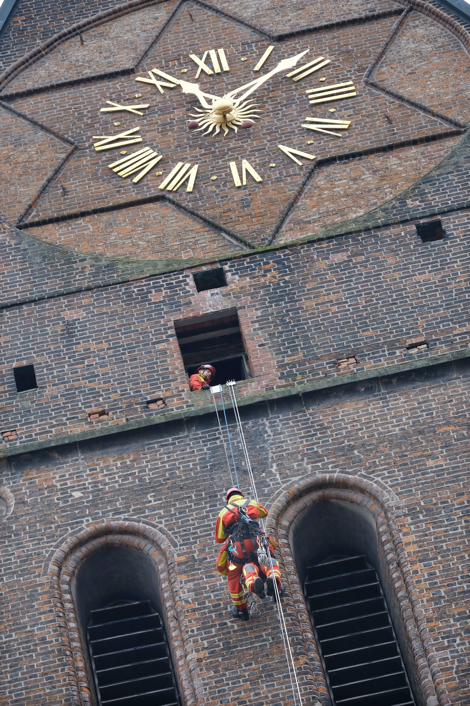 Die Experten machten diverse Eigenheiten der evangelischen Kirche aus rotem Backstein aus. Das enge Treppenhaus des mittelalterlichen Turmes sei eine besondere Schwierigkeit, erläuterte Hoyer, der die Fachgruppe Höhenrettung leitet. Zudem seien nicht alle Fenster von innen gleich gut erreichbar, um Patienten nach außen bringen zu können. Am Treppengeländer mangele es zudem an stabilen Festpunkten, um Seile zu befestigen.