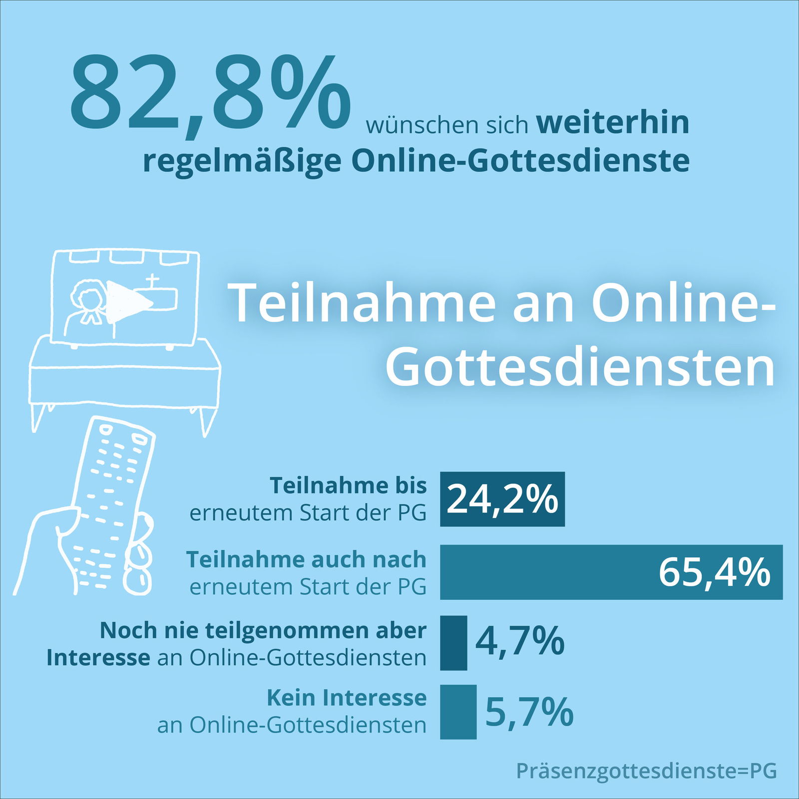 Die große Mehrheit der Online-Gottesdienstbesuchenden möchte auf diese Form des Gottesdienstes nicht mehr verzichten. So hatten 65,4 Prozent aller Befragten auch nach Ende des Lockdowns weiterhin an digitalen Gottesdiensten teilgenommen. Eine besonders hohe Zustimmung findet diese Gottesdienstform in der Altersgruppe der 41- bis 60-Jährigen. Viele Teilnehmende an Online-Gottesdiensten nutzten dieses Angebot intensiv und regelmäßig: Mehr als 80 Prozent der Befragten hatten mindestens vier Online-Gottesdienste besucht, 32,7 Prozent waren mindestens zehn Mal dabei. Dabei hatten 66,7 Prozent der Befragten vor Corona keine Erfahrung mit digitalen Gottesdiensten. Nur 2,8 Prozent nahmen schon vorher regelmäßig an Online-Gottesdiensten teil.