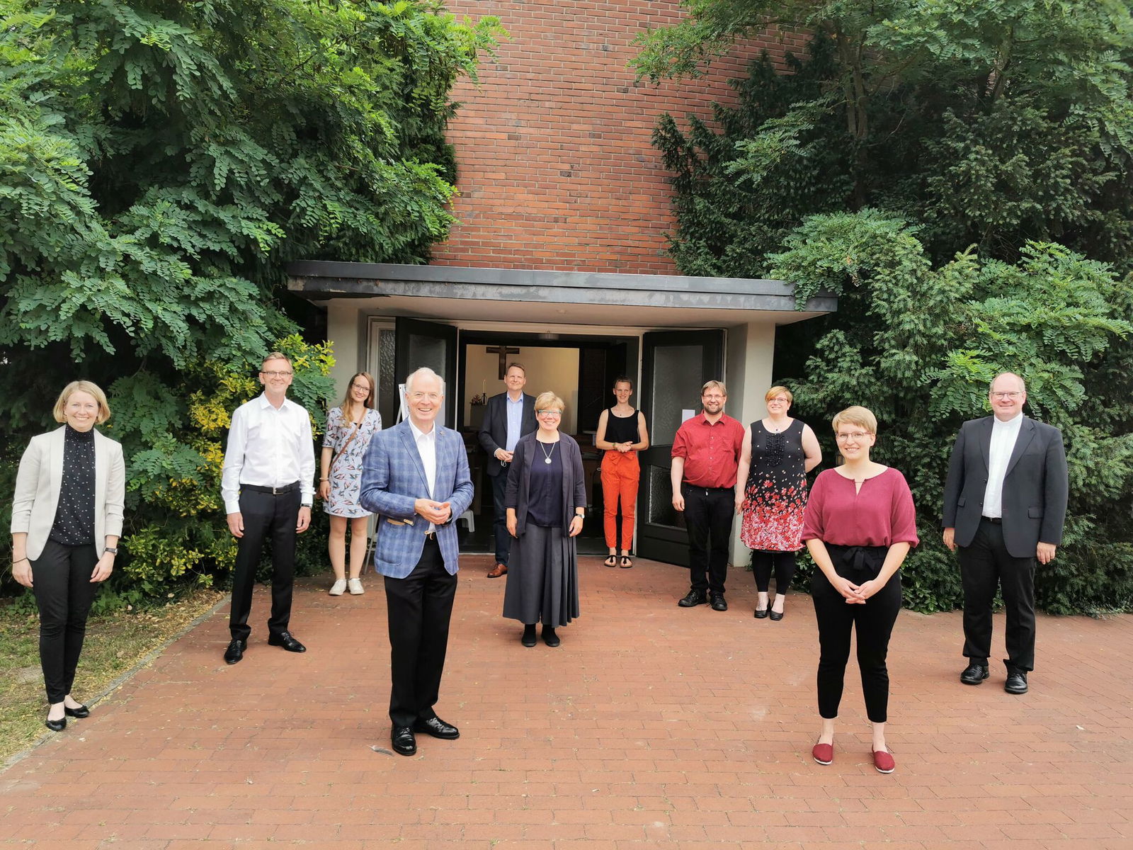 Zusammen mit drei Weggefährtinnen Gorals, namentlich Franziska Bau, Diakonin Anna Schlendermann und Sr. Christiane Marei Steins, sprach Detlef Klahr der neuen Mitarbeiterin den Segen zu und überreichte die Einsegnungsurkunde – unterschrieben von Inga Rohoff, Leiterin des Referats für Diakon*innen im Landeskirchenamt Hannovers und gleichzeitig Vorgängerin von Anja Goral in Nordhorn.