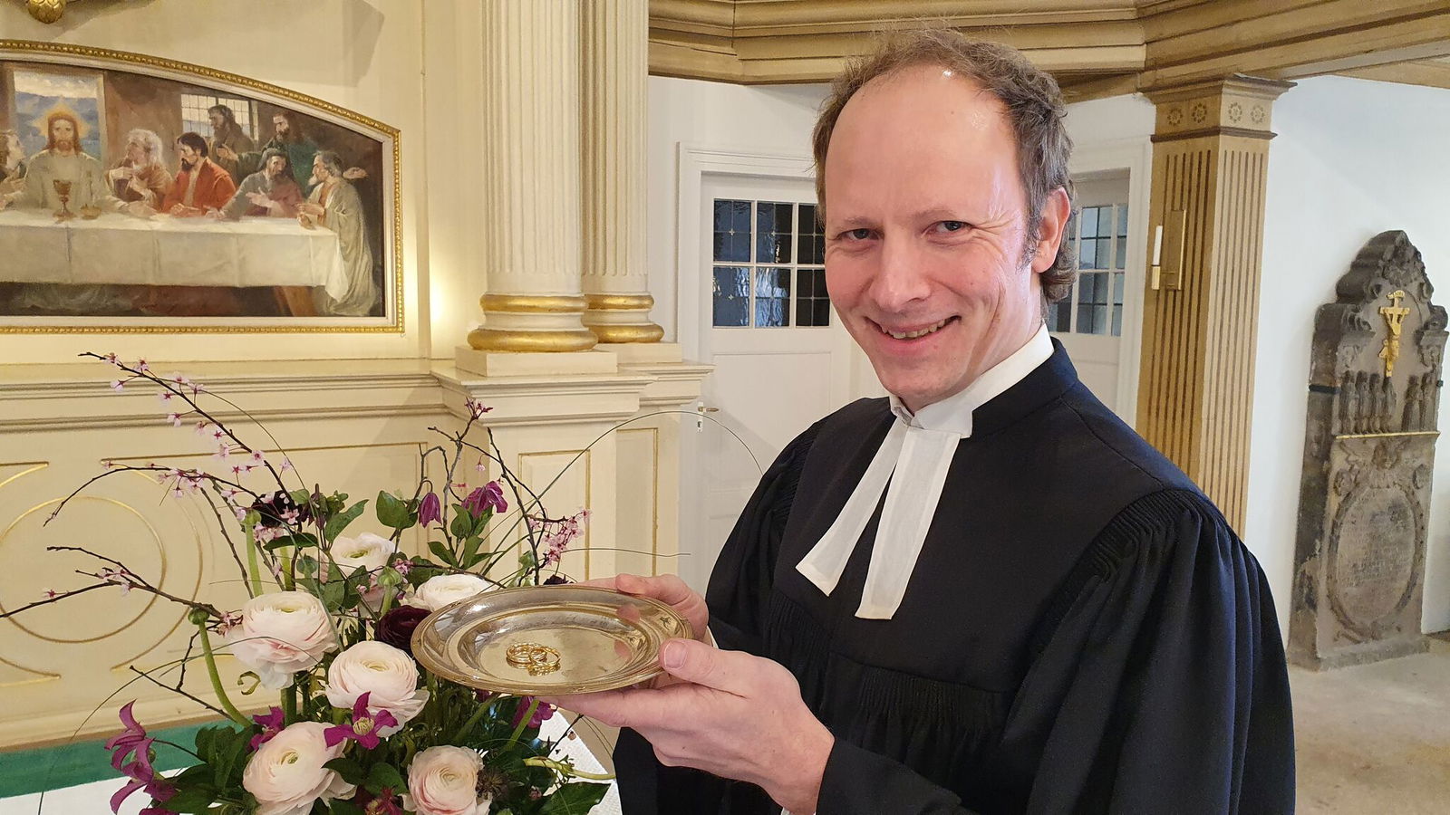 „Wir sind schon ganz gespannt“, sagt Pastor Dirk Jonas und seine Kollegin Elisabeth Rabe-Winnen ergänzt: „Hochzeiten sind natürlich immer etwas Besonderes – aber morgen wird es noch auf eine weitere Art aufregend, am 22.2.2022!“ In der St. Pankratius-Kirche Burgdorf können Paare an diesem Dienstag ganz spontan, ohne bürokratische Voranmeldung heiraten. Zwischen 11.30 Uhr und 15 Uhr sowie 20 und 22 Uhr stehen Teams aus Pastor*innen, Ehrenamtlichen und Musiker*innen bereit – unter anderem auch Valentin Winnen, der auf dem Foto Ringe präsentiert. Mitzubringen sind nur die Heiratsurkunde vom Standesamt und die Personalausweise. Vier Paare haben sich schon angekündigt. „Ein Paar erzählte mir, dass es schon lange verheiratet ist und nun doch auch den kirchlichen Segen will“, sagt Dirk Jonas. Wer noch nicht standesamtlich verheiratet oder verpartnert ist, kann sich übrigens auch einen Segen für die Liebe geben lassen.
