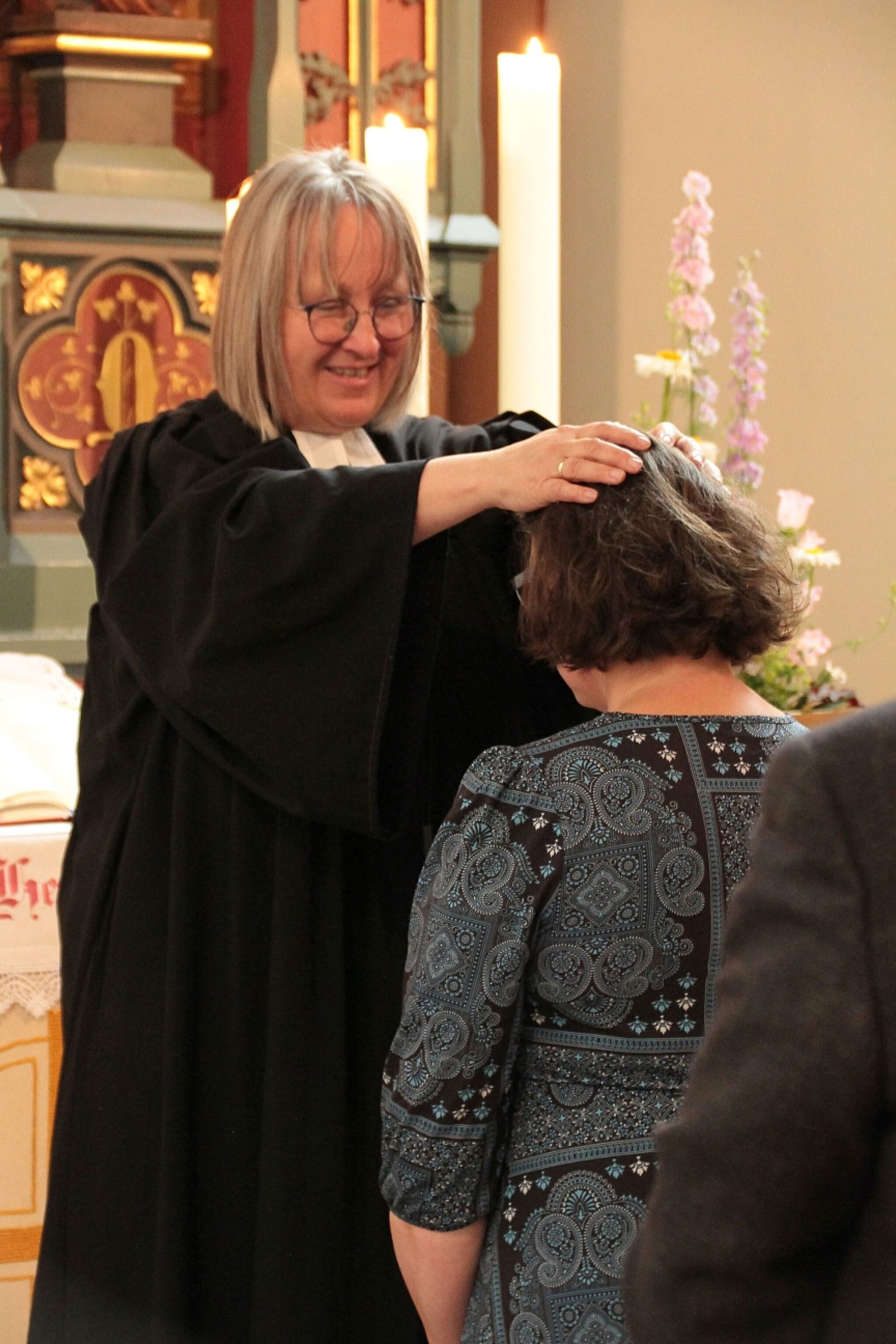 "Um meine Arbeit gut zu machen, braucht es die unbedingte Liebe Gottes, seine Gnade und die christliche Gemeinschaft in Beziehung mit anderen und mit Gott, die mir die Kraft dazu geben und mir immer wieder den Weg weisen", so Diakonin Dörrie. Passend dazu hat sie sich ein Wort aus dem 32. Psalm als Einsegnungsspruch ausgesucht: "Ich will dich unterweisen und dir den Weg zeigen, den du gehen sollst, ich will dich mit meinen Augen leiten." Superintendentin Nadjé-Wirth betonte, dass es Christine wichtig sei, sich weiterzuentwickeln, zu verstehen und Neues zu lernen – sich unterweisen zu lassen und in den Austausch mit anderen zu kommen. Sie bekräftigte, dass Gott mit auf dem Weg sei und im Rückblick manchmal besser erkennbar ist, "dass alle Kurven, die man gedreht hat, die scheinbaren Umwege, zu einem guten Ziel geführt haben". So empfindet es auch Christine Dörrie. Dass Gottes Augen über sie wachen, schenkt ihr Gelassenheit und Trost, weil sie darauf vertrauen kann, begleitet zu sein und Fehler machen zu dürfen – und trotzdem von Gott bedingungslos geliebt zu sein. Superintendentin Nadjé-Wirth drückte es in ihrer Predigt so aus: "Wenn Gott uns anschaut, dann voller Liebe. Er sieht schon auch die Flecken und Macken, aber darunter, dahinter sieht er sein wundervolles Kind, das er bedingungslos liebt. Wie schön, dass der Aufkleber auf deinem Laptop dich immer wieder daran erinnert: Sola Gratia, allein aus Gnade, allein aus Barmherzigkeit, allein aus Liebe. Mögest Du das für Dich selbst immer so glauben können. Und mögen die Menschen, denen Du begegnest, das durch Dich auch immer wieder so erfahren."