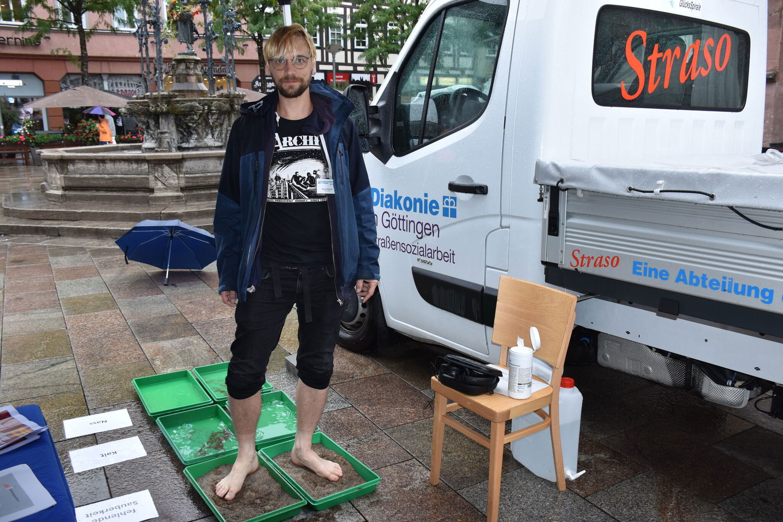 Um nachzuvollziehen, mit welchen Problemen Wohnungslose zu kämpfen haben, konnten Passant*innen diese in Form eines Erlebnisparcours kennenlernen. Zusätzlich informierten an einem Infostand der Leiter der Straßensozialarbeit, Mike Wacker, und seine Mitarbeitenden über ihre Arbeit und ihre Forderungen an die Politik. Eingeladen waren auch die Landtagskandidat*innen für den Wahlkreis 16 Göttingen‐Stadt, um zu hören, was sie und ihre Partei zur Bekämpfung der Wohnungsnot vorhaben.