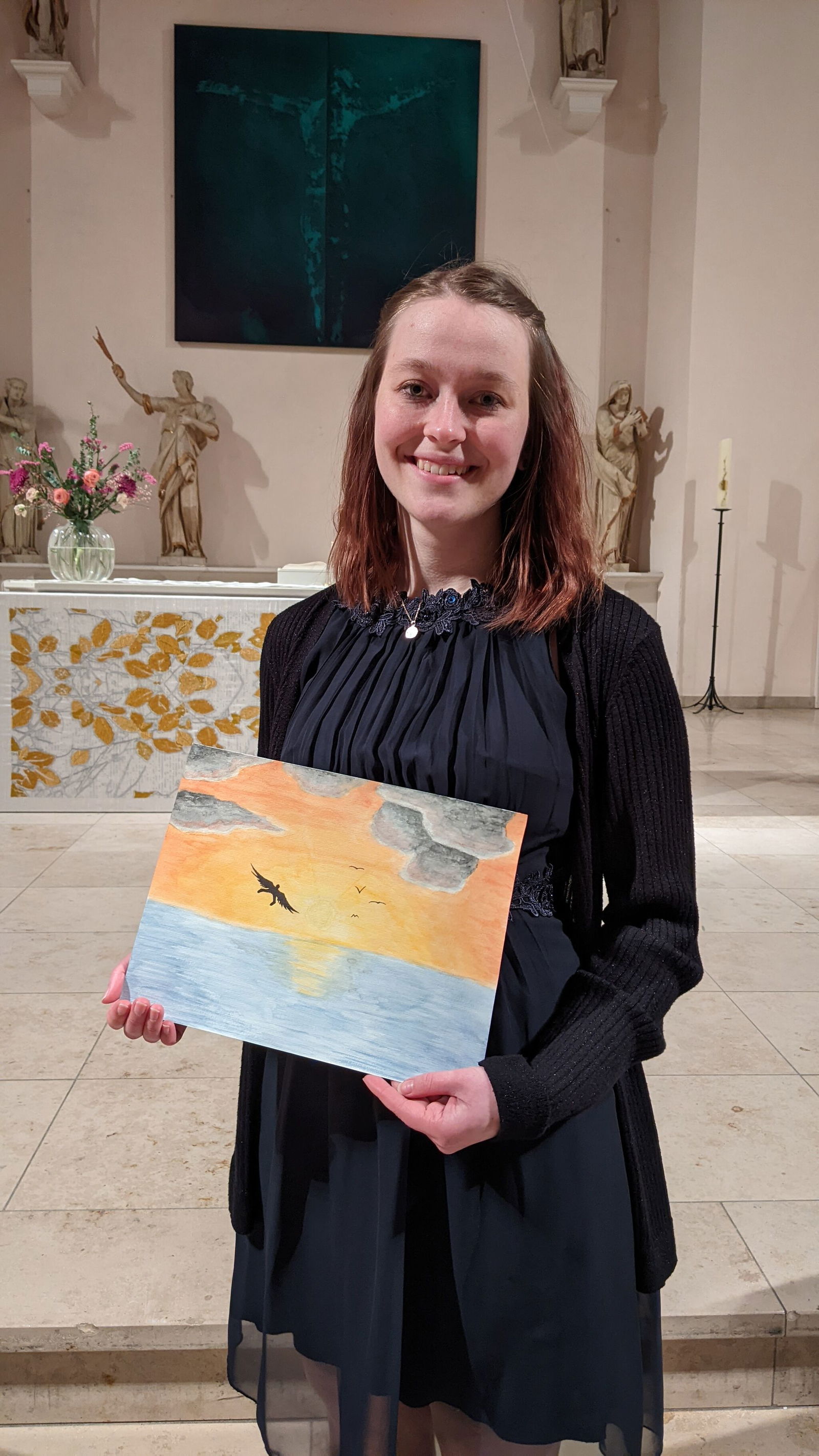 Zum Gottesdienst in der Neustädter Hof- und Stadtkirche hat sich Lisa Hartkopf als Einsegnungsspruch Psalm 139, 9-10 ausgesucht: ,Nähme ich Flügel der Morgenröte und bliebe am äußersten Meer, so würde auch dort deine Hand mich führen und deine Rechte mich halten.' "Die Verse sind mir früh im Studium aufgefallen und haben mich seitdem nicht mehr losgelassen - weil sie so poetisch sind und ich gleich ein Bild dazu im Kopf hatte." Das hat sie auch grafisch festgehalten: auf Papier mit Aquarellfarben. Ihr Teamleiter Andreas Behr war ähnlich beeindruckt: "Frei sein, dabei aber immer geboren bei Gott - was für ein großartiges Bild."