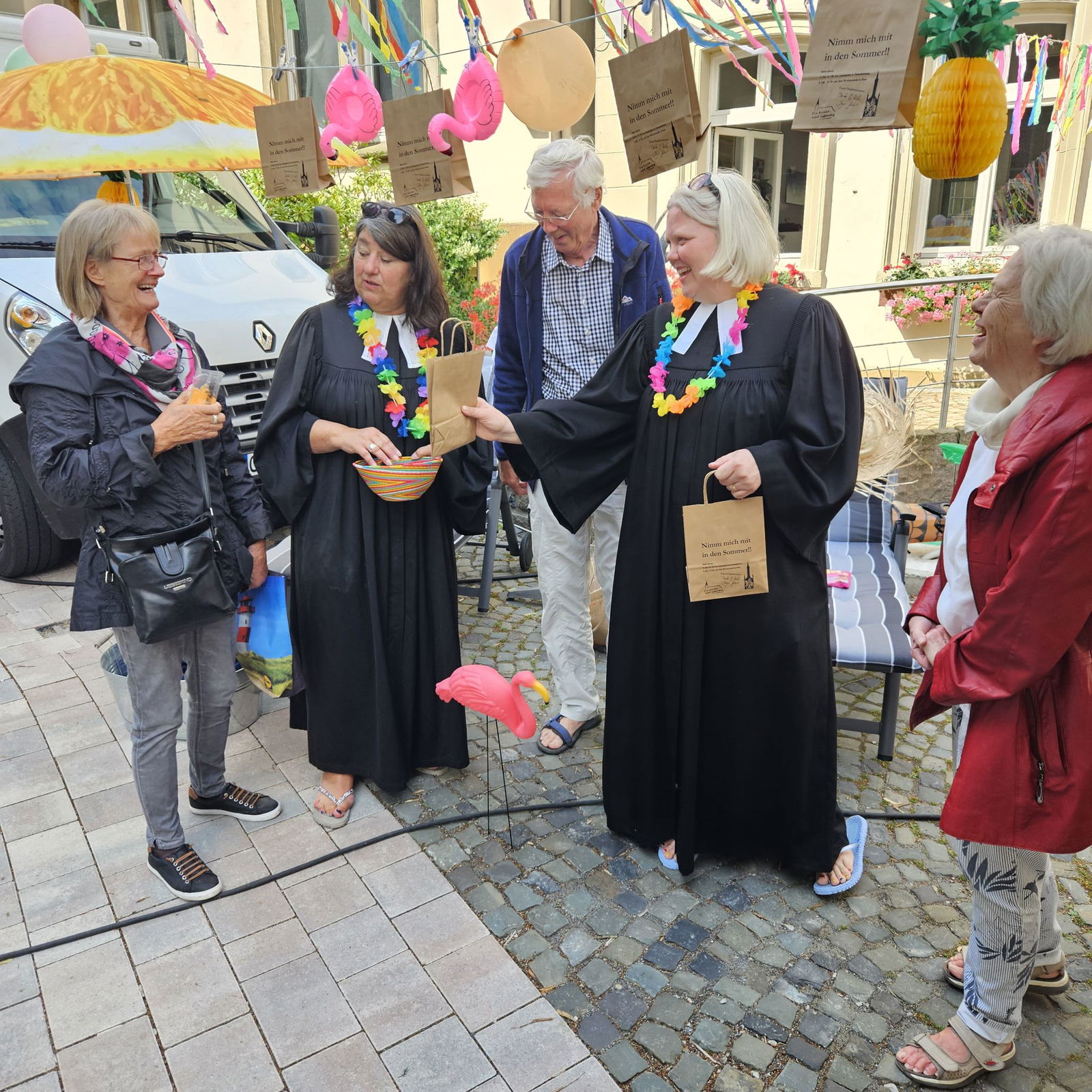 1.500 Tüten mit der Beschriftung „Nimm mich mit in den Sommer“ und unterzeichnet von beiden Pastorinnen hielten kleine Überraschungen wie Malkleide, Wasserbälle, Knicklichter und Buntstiften bereit. „Wir haben sie überall in den Orten an Wäscheleinen aufgehangen: an Tankstellen, in Supermärkten, in den Schulen und Kindergärten“, so Göbert, „Damit haben wir auf unsere Aktion aufmerksam gemacht und so konnten uns alle danach am Lindenplatz oder auf dem Markt in Buer besuchen kommen.“ Mit einer kleinen Ferienoase bestehend aus aufgeblasenen Palmen, Liegestühlen, Girlanden, rosa Flamingo und einer Zinnwanne mit gekühlten Getränken empfingen die Pastorinnen die Besucher und verteilten 2.000 kleine Giveaways wie Frisbee-Scheiben, Duftaufhänger für das Auto und Luftballons. „Die zwei Stunden sind wie im Flug vergangen, da wir so viele Gespräche geführt und Bonbons verteilt haben“, resümiert Uhrhan-Holzmüller. Das war gerade das Ziel der beiden