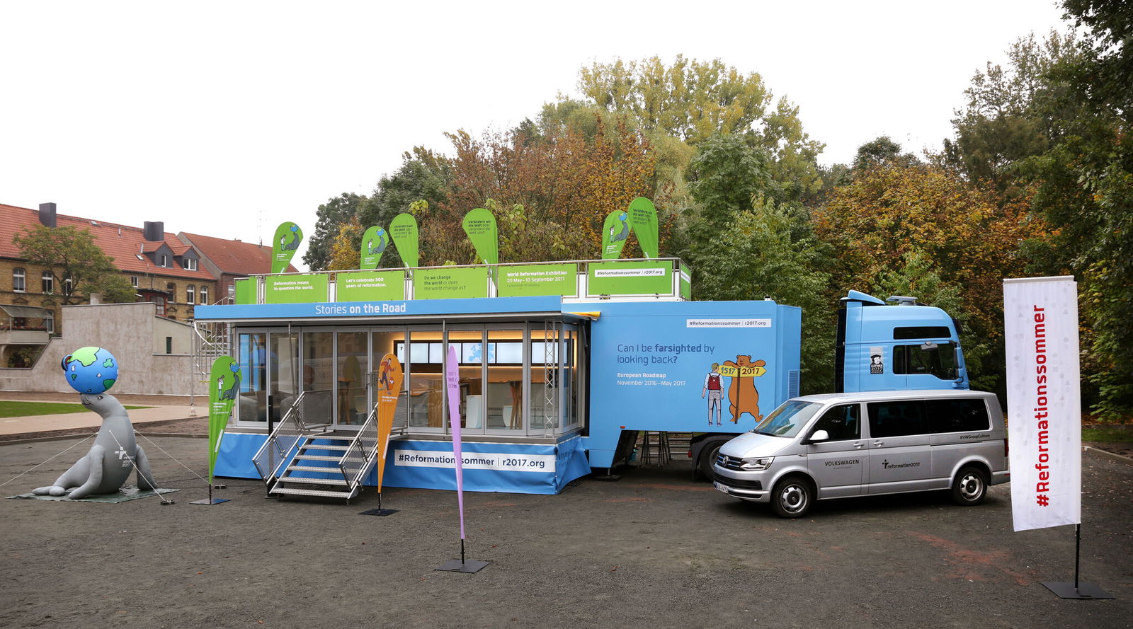 Am Donnerstag, 24.11.2016, ist der als Geschichtenmobil gestaltete Truck ab 10 Uhr auf dem Platz zwischen Schloss und OsnabrückHalle für alle Interessierten geöffnet: Im Innenraum ist das Geschichtenmobil mit mehreren Screens und Multimedia -Angeboten ausgestattet, die den Besucherinnen und Besuchern zum einen die Möglichkeit geben, die beim Geschichtenmobil und auf den Stationen gesammelten Reformationsgeschichten zu erleben; zum anderen können aber auch eigene Reformationsgeschichten in unterschiedlichen medialen Formaten erzählt werden. Diese neu erzählten Geschichten nimmt der Truck weiter mit auf Reisen.