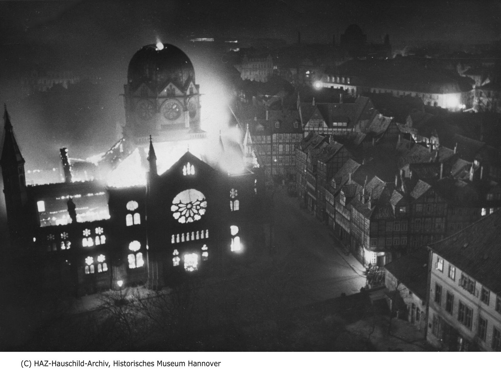 Reichspogromnacht: Nazis zündeten auch die Synagoge in Hannover an. Das Foto entstand vom Turm der benachbarten Neustädter Hof- und Stadtkirche. Bild: HAZ-Hauschild-Archiv, Historisches Museum Hannover