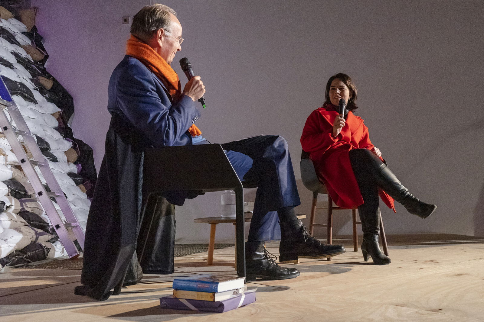 Das Sachbuch "Die Welt ohne uns" des US-amerikanischen Wissenschaftsjournalisten Alan Weisman zeigt die Erde, nachdem der Mensch verschwunden ist. Die positive Botschaft: Der Planet mit all seiner Schönheit werde weiterbestehen, sagt Baerbock. Die negative: Auch die Umweltverschmutzung, die durch Fortschritt und Technik entstanden ist, überdauere eine lange Zeit. Meister nennt dies eine "Ewigkeitslast". Mit Blick auf dieses Spannungsfeld zwischen Mensch und Natur plaudert Baerbock dabei aus dem Politikerinnen-Nähkästchen: Kürzlich hätten die Grünen geradezu "endlos" darüber diskutiert, für wen sie in erster Linie Politik machten: für die Menschen oder die Umwelt. In der Folge beginne der Entwurf des Grundsatzprogramms, das die Partei zu ihrem 40. Bestehen im kommenden Jahr derweil neu entwickelt, nun mit dem Satz: "Im Mittelpunkt unserer Politik steht der Mensch in seiner Würde und in Freiheit."