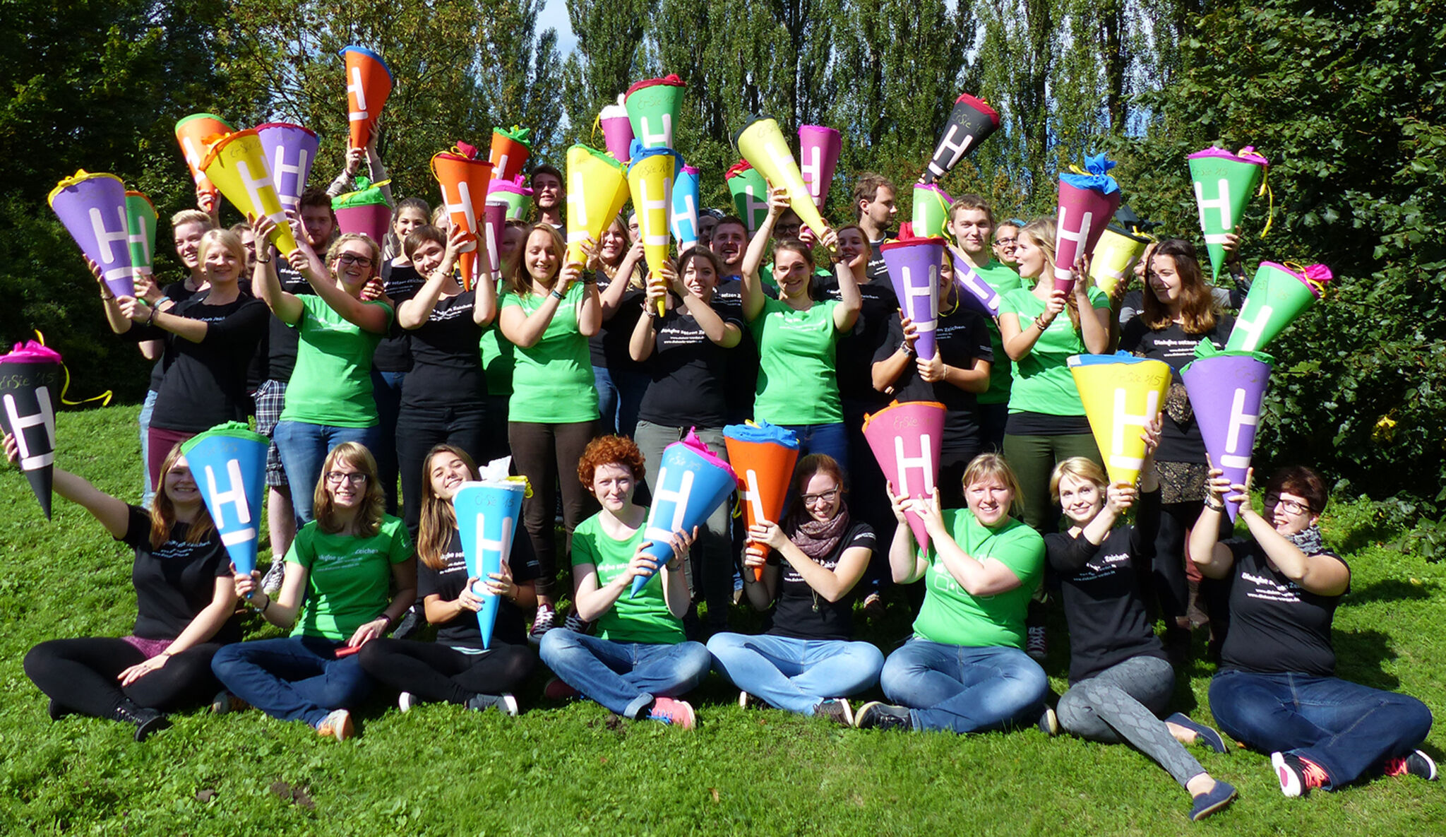 42 neue Studierende auf dem Hochschulcampus in Hannover freuen sich über und „Studierendentüten“ zum Semesterbeginn. Bild: Hochschule Hannover
