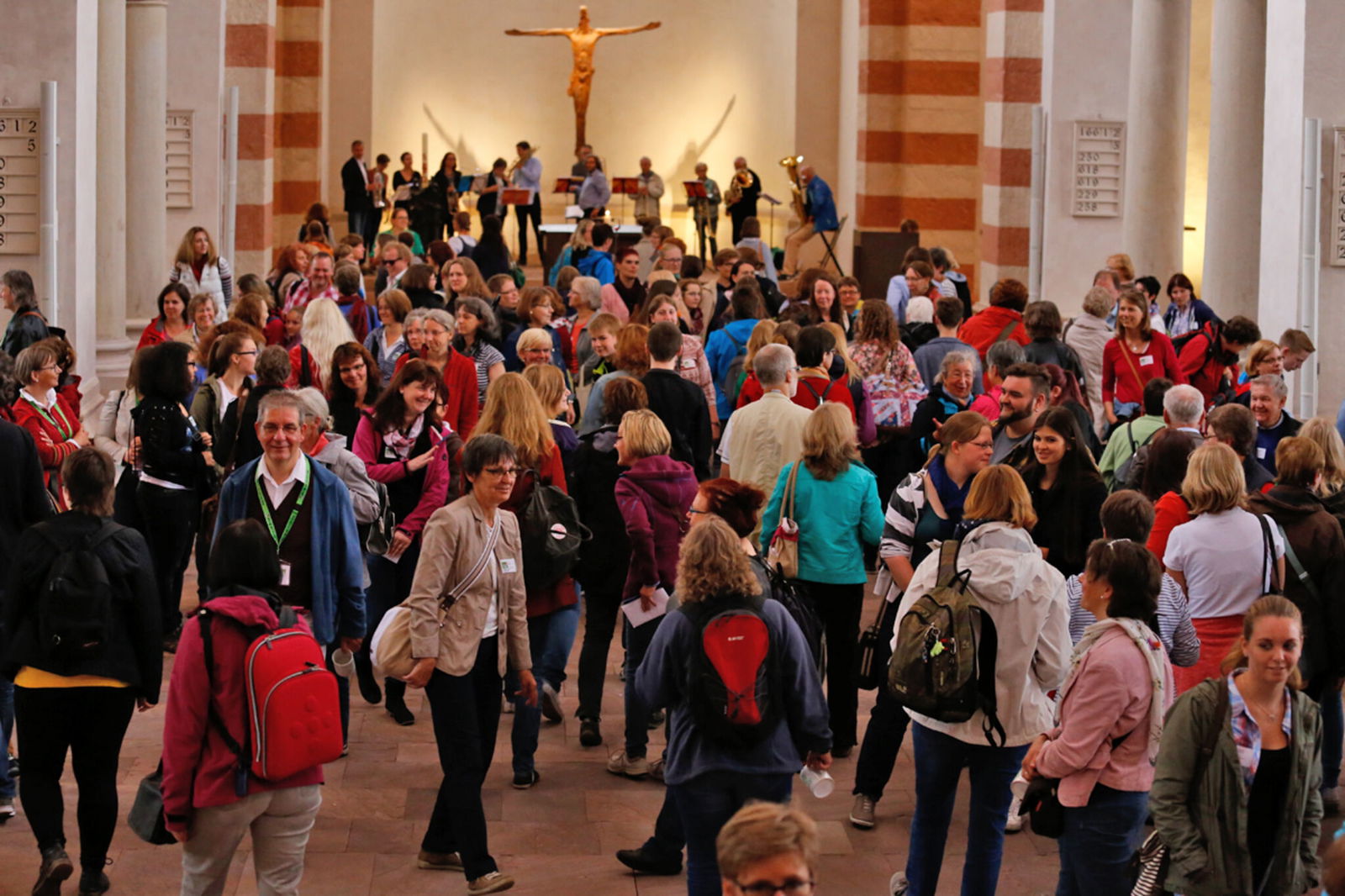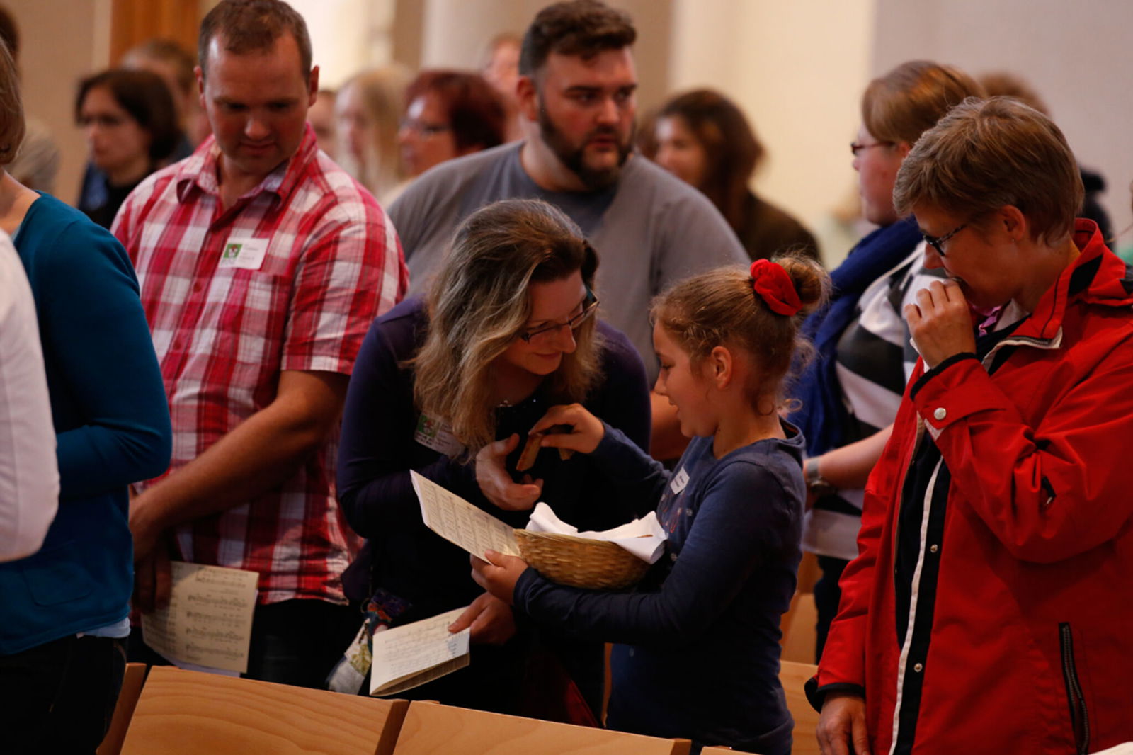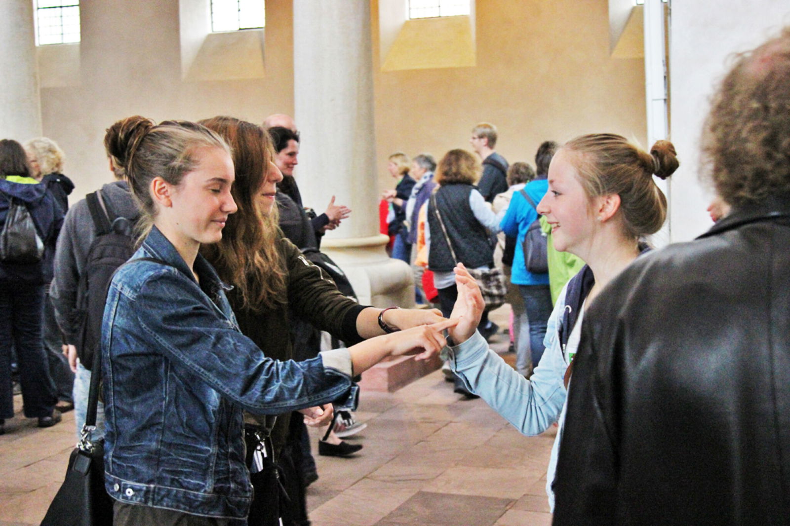 Schon bei der Ankunft erhielten alle Teilnehmenden eine Kindergottesdienst-Tasse für fairen Tee, Kaffee und Wasser. In der Eröffnungsfeier in der überraschend stuhlfreien tausendjährigen St. Michaeliskirche wurden wesentliche nonverbale Begegnungen, die besonders Kinder brauchen, leibhaft erlebt: Tönen und gehört werden, schauen und gesehen werden, Anlehnen und nicht abgelehnt werden. Bewegend: Ein „Tanz der Blicke“, gefühlvoll begleitet vom Posaunenchor der Christuskirchengemeinde. Und immer wieder die Frage: Welche berührenden Erfahrungen können und sollen Kinder im Kindergottesdienst machen? Erfahrungen, die mit gewaltsamen Übergriffen nichts zu tun haben, sondern mit der heilsamen biblischen Begegnungskultur.
