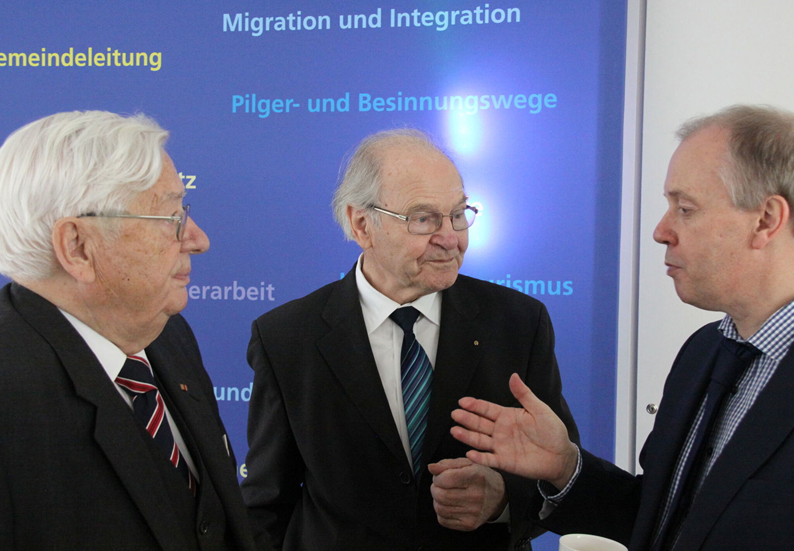 Der damalige „Bauherr“ und spätere Vizepräsident im Landeskirchenamt Dr. Werner Knüllig (von links), der damalige Architekt Heinrich Matthies und der jetzige Landeskirchenbaudirektor Werner Lemke. Bild: Gunnar Schulz-Achelis