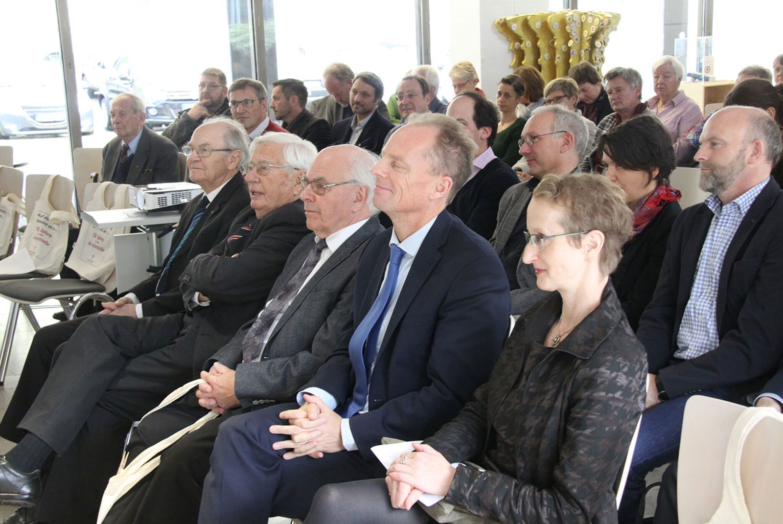 Ehrengäste beim Haus-Jubiläum (von links) der damalige Architekt Heinrich Matthies, der spätere Vizepräsident im Landeskirchenamt Dr. Werner Knüllig, Superintendent a.D. Peter Tidow, der vor 50 Jahren mit in den Neubau umzog, Dr. Niels Kämpny vom benachbarten Umweltministerium und die Präsidentin des Landeskirchenamtes Dr. Stephanie Springer. Bild: Gunnar Schulz-Achelis