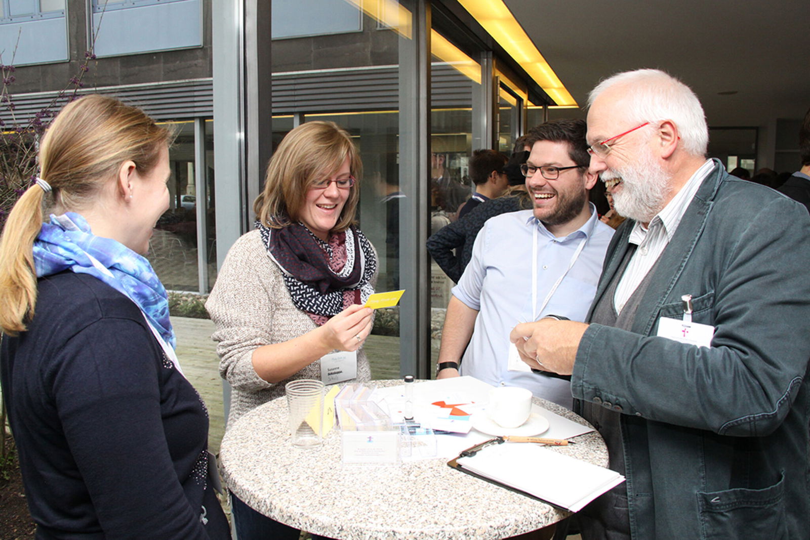 „Wie stellen Sie sich Kirche in der Zukunft vor? Wo wollen Sie mutig Kirche sein? Was ermutigt Sie?“ Zu diesen Fragen waren alle Teilnehmenden des Tages eingeladen, miteinander ins Gespräch zu kommen. An Stehtischen kamen per Zufallsprinzip Referentinnen des HkD und angehende Pastoren und Diakoninnen zusammen. Vorbereitete Fragekarten gaben Impulse für den Austausch.