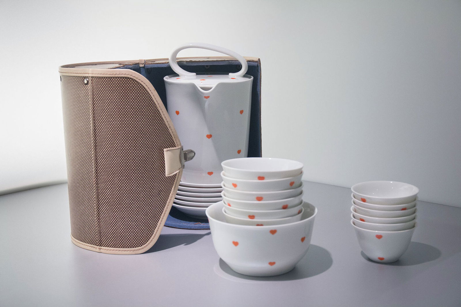 Im Westen setzt Wagenfeld in dieser Hinsicht Maßstäbe. So bekommt er 1954 den prestigeträchtigen Auftrag, für die Deutsche Lufthansa das erste Bordgeschirr zu entwickeln. Das fertige Produkt aus porzellanähnlich glänzendem Melamin ist in der Ausstellung zu sehen. Die elegant abgerundeten Rechteckformen der Teller und Schalen werden von den Fluggästen begeistert aufgenommen und sind Vorbild für weitere Bordgeschirr-Serien.