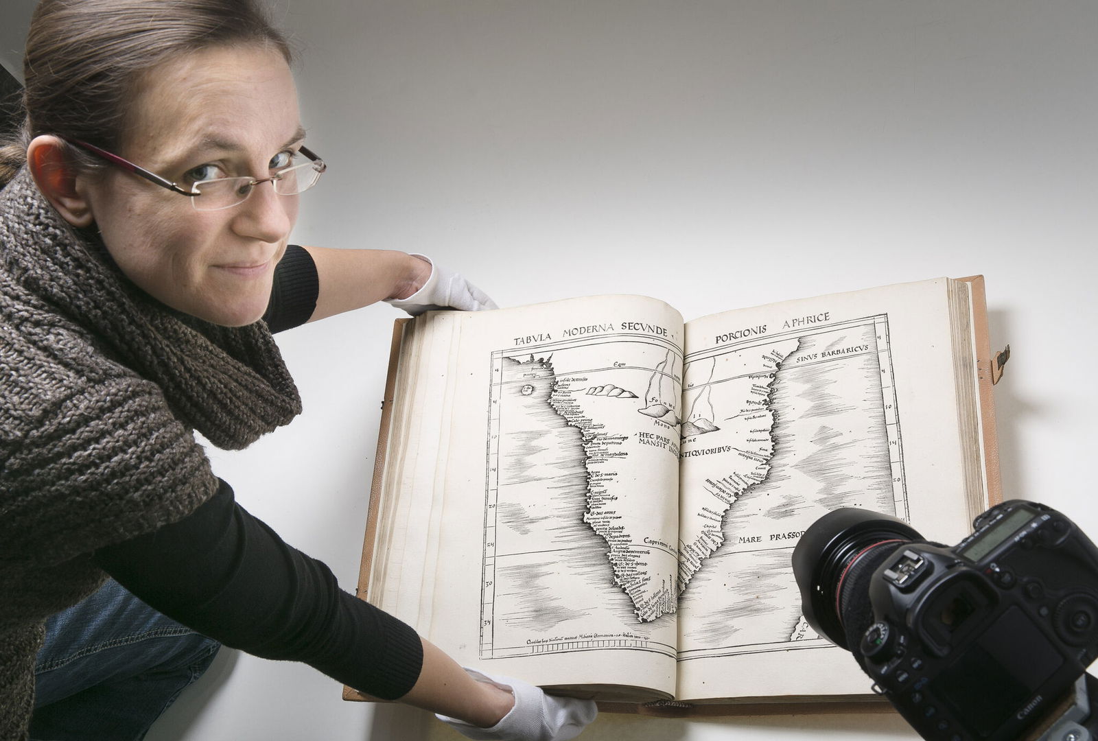 Etliche Stockwerke höher, in einer kleinen Dachkammer lichtet Fotografin Anja Pröhle alle Exponate für den Ausstellungskatalog ab. Gerade rückt sie einen Keil aus Styropor unter einen großen, schweren Atlas aus dem Jahr 1520. Aufgeschlagen ist eine Zeichnung vom damals erst anfangsweise entdeckten afrikanischen Kontinent. Während an der Küste etliche Namen verzeichnet sind, ist das Landesinnere fast komplett leer.