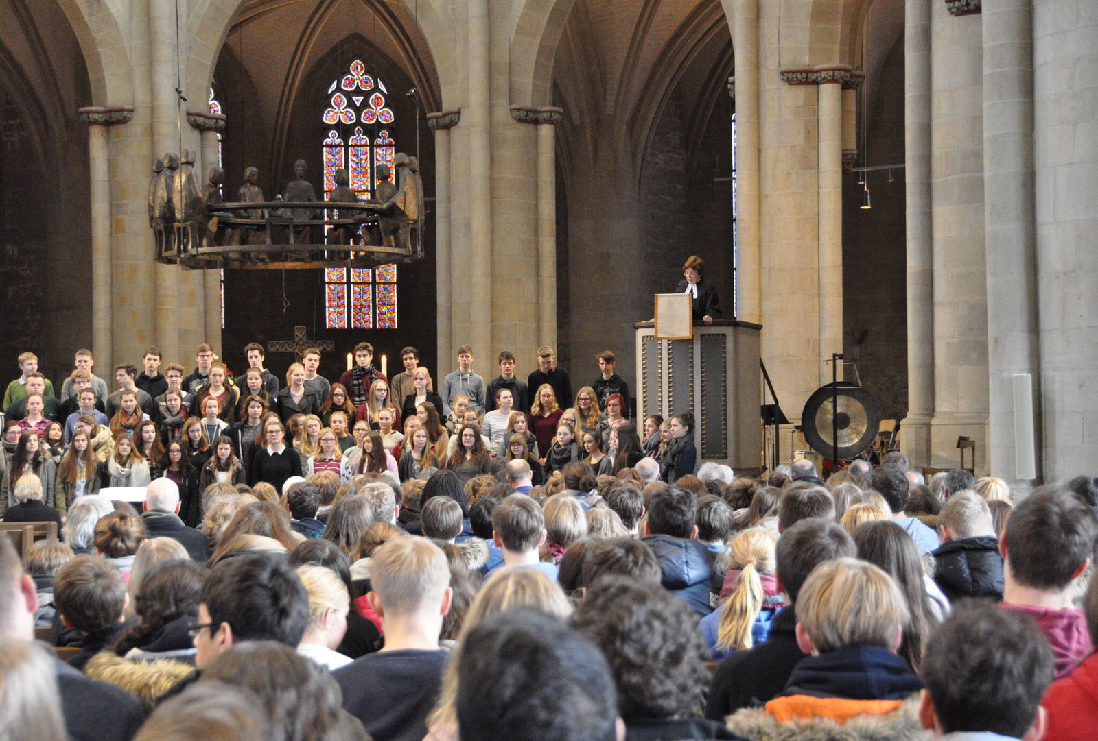 Die gesamte Schülerschaft des Hildesheimer Gymnasiums Andreanum hatte sich in der Sankt Andreaskirche versammelt, um Dirk Wilkening zu begrüßen und mit ihm den Einführungsgottesdienst in seine neue Aufgabe als Schulleiter des Gymnasiums in Trägerschaft der Evangelisch-lutherischen Landeskirche zu feiern. Auch das Kollegium der Schule und viele Eltern hatten sich auf den Weg gemacht, um bei der Festlichkeit in der vollbesetzten Andreaskirche dabei zu sein. Für die Landeskirche und deren Evangelisches Schulwerk begrüßte Frau Oberlandeskirchenrätin Kerstin Gäfgen-Track den 52jährigen Wilkening, der zuvor stellvertretender Schulleiter an einer evangelischen Schule in Bielefeld war. In der Stadt an der Innerste ist Wilkening, der als Lehrer Deutsch, evangelische Religion und Theater unterrichtet, zur Welt gekommen. Umramt wurde die Feier vom Schulchor des Andreanums und vom Bläserensemble und auch die Gemeindelieder wurden von Fanny Sommerfeld, ebenfalls als Schülerin der Schule, an der Orgel begleitet.
