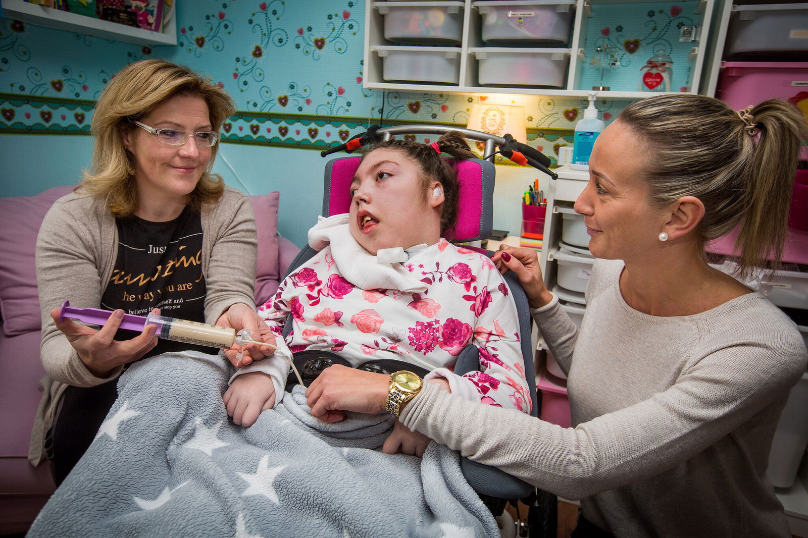 Habermann ist Fachkraft für ambulante Kinderpalliativpflege. Sie sorgt seit vier Jahren dafür, dass Eftelya zu Hause bei ihrer Familie bleiben kann und nur selten in die Klinik muss. Sanft streicht sie über den Arm des Mädchens: "Wir tun alles, damit es ihr gutgeht." Mutter Melahat Dogdu (28) ist froh, dass Janine Habermann Blut abnehmen, Medikamente spritzen, bei plötzlicher Atemnot eingreifen kann und immer mit den Ärzten in Kontakt steht. "Ich vertraue ihr", sagt Dogdu. Dabei drückt sie ihren Jüngsten liebevoll an sich.