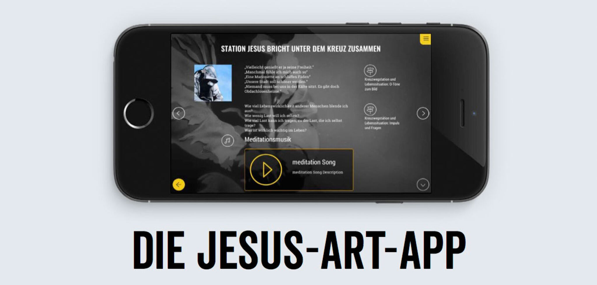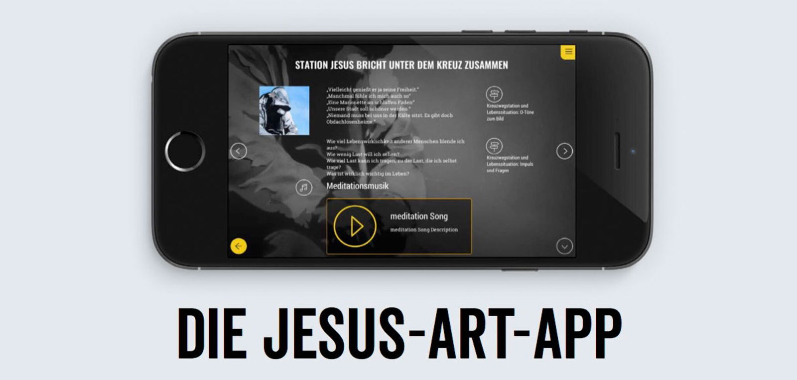 Alle Inhalte gibt es auch in der erstmals angebotenen interaktiven App „JesusArt“ für Smartphone und Tablets. Die App ermöglicht das Gebet in der Gruppe oder kann auch als persönliche GebetsApp genutzt werden. Passend zur Kunstform enthält der Materialkoffer auch eine Schablone mit Sprühkreide.