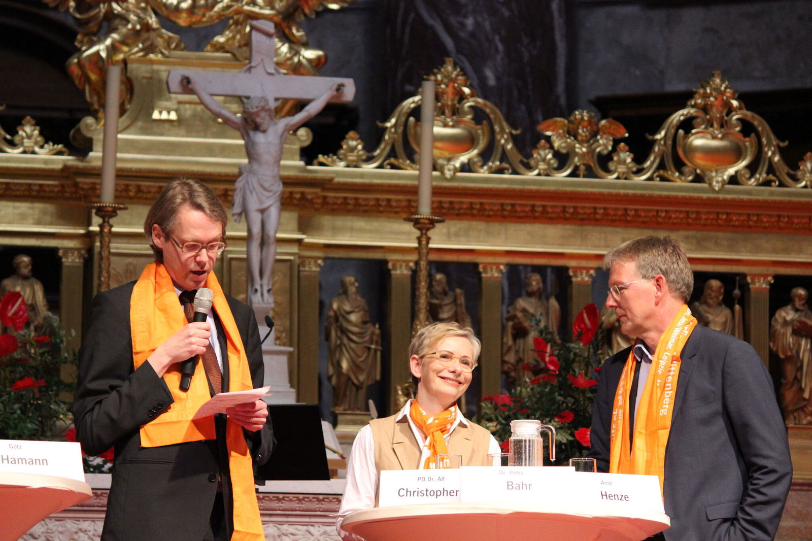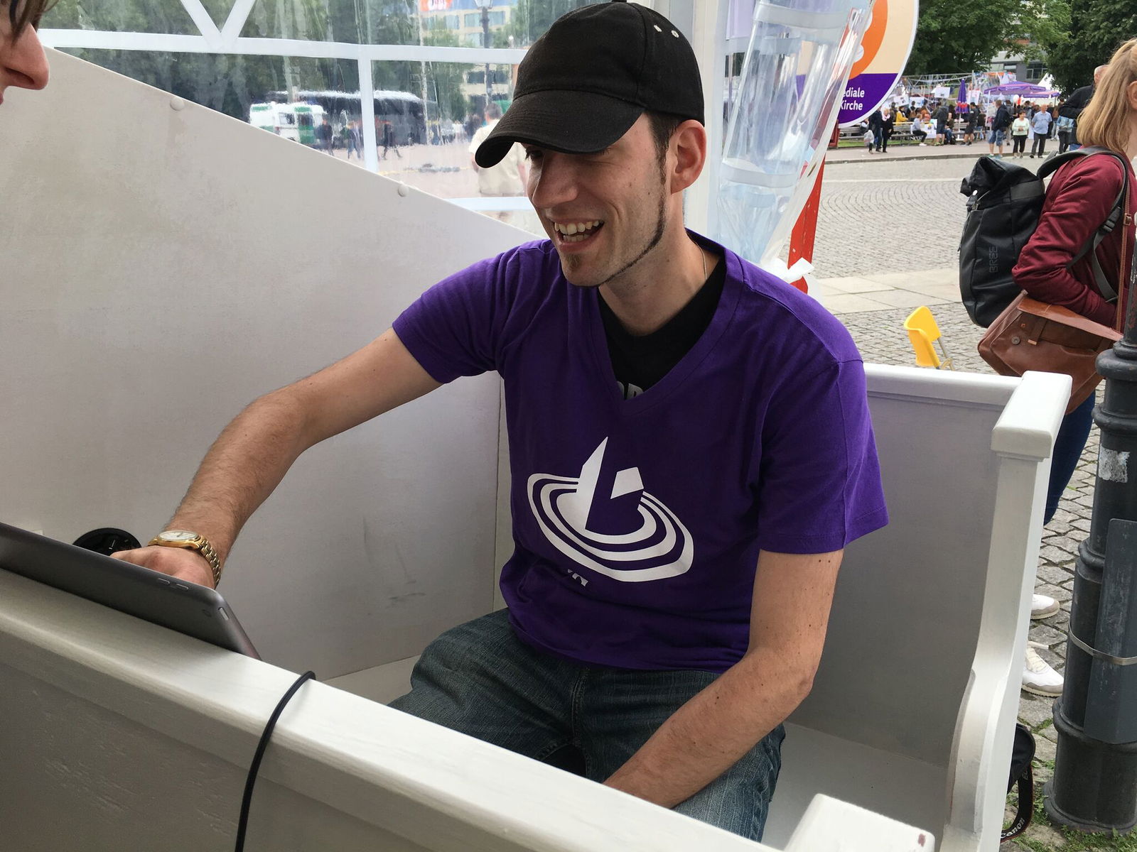 Einige Stunden zuvor hatten unter dem Berliner Fernsehtum in direkter Nähe zum Dom digital Kreative ihre innovativen Projekte auf dem Weg zu einer #smartchurch vorgestellt. „Begeisterung teilen“ will Pfarrer Rasmus Bertram aus Frankfurt am Main, der mit seinem Team und einer speziellen Software (sublan.tv) interaktive Gottesdienst mit über Smartphones und Tablets von den Besucherinnen und Besuchern eines Gottesdienstes geposteten Fragen und Anregungen realisiert. Die Begeisterung für diese neue Art der Interaktion im Kirchenraum ist dem Theologen und Schauspieler anzumerken. Jeder kann sich in seinem Gottesdiensten einbringen. Das verstehe er als Umsetzung des Missionsbefehls: Gehet hin in alle Welt.