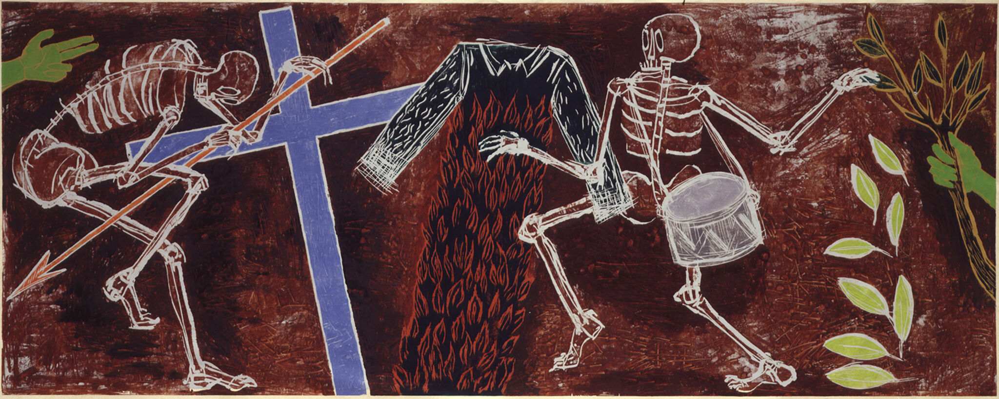 Ein Motiv aus dem Totentanz von Lisa Huber ist überschrieben:„Der Tod trägt ein Hemd aus Feuer und Maden.“ Bild: Privat
