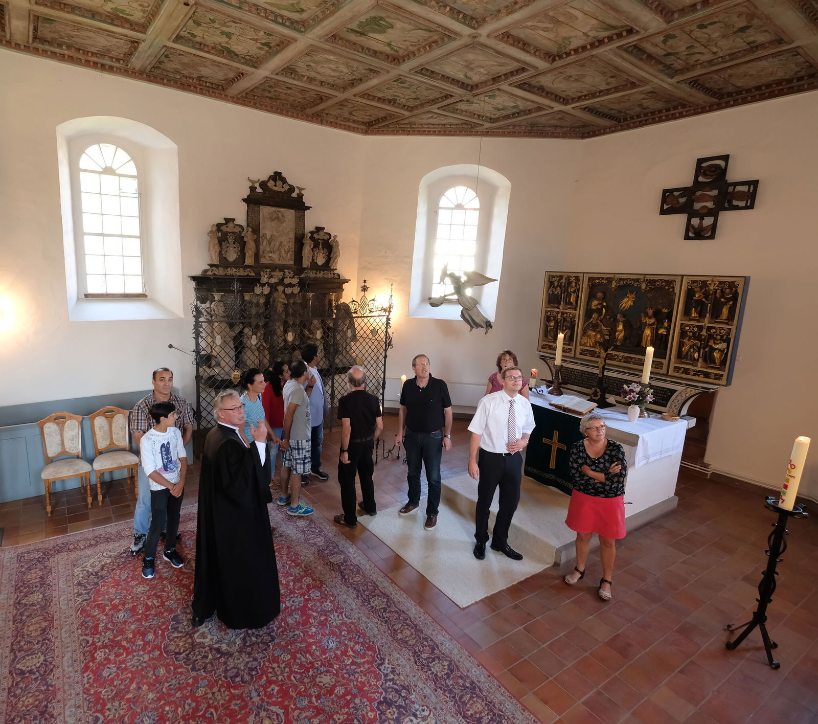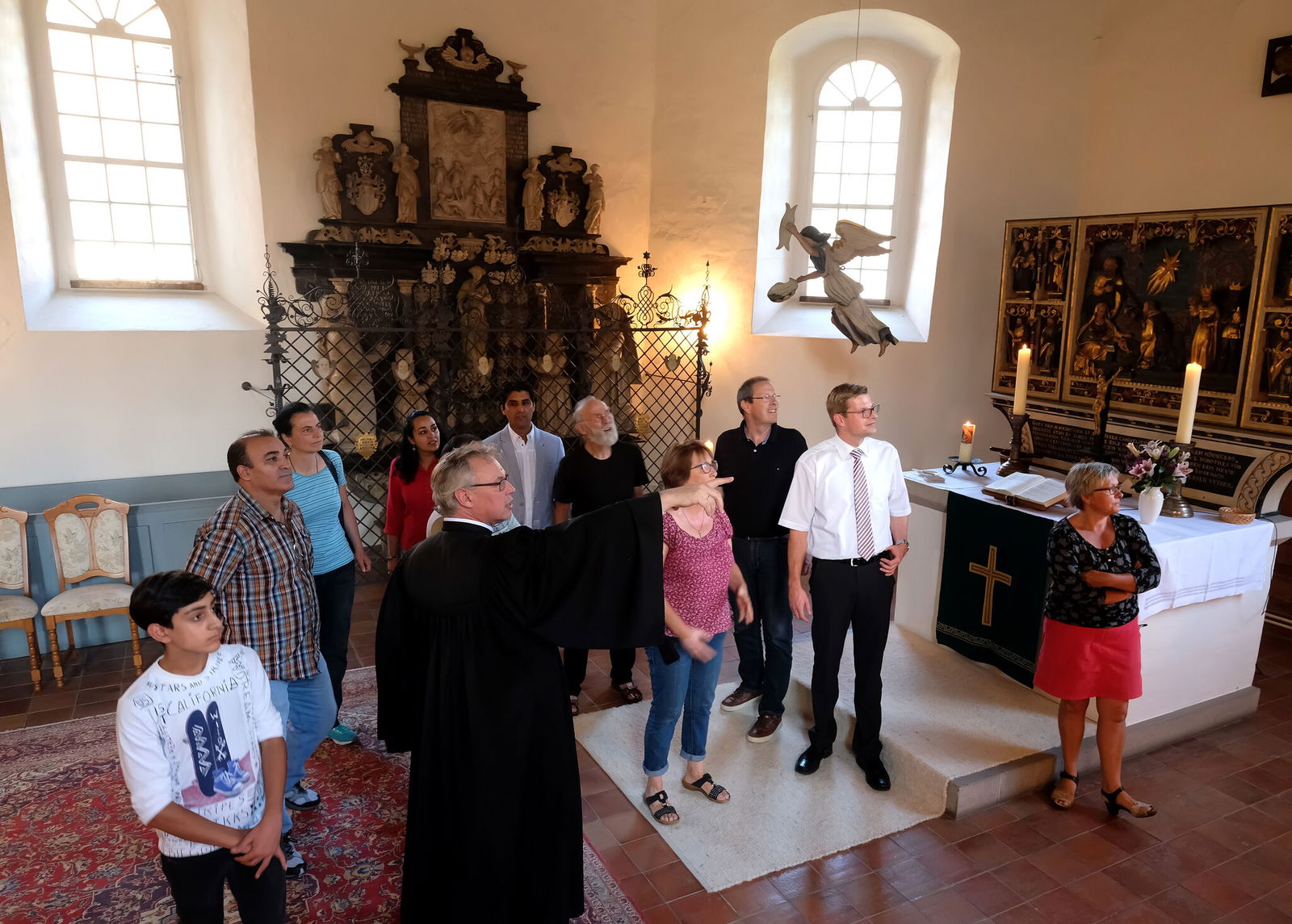 Seit der sogenannten Flüchtlingskrise nutzt der Landkreis Göttingen die Nebengebäude des historischen Wasserschlosses als Sammelunterkunft - derzeit leben etwa 80 Flüchtlinge dort. Dass man sich im Dorf grüßt, haben die "Neu-Wollershäuser" schnell gelernt, sagt Edelmann schmunzelnd, während Sehpr sich vor der Kirche zu ihm stellt. Nach und nach kommen immer mehr Flüchtlinge die Dorfstraße entlang. Pastor Edelmann will eine kleine Führung durch den historischen Kirchenraum machen. Auch ein paar Dorfbewohner sind dabei.