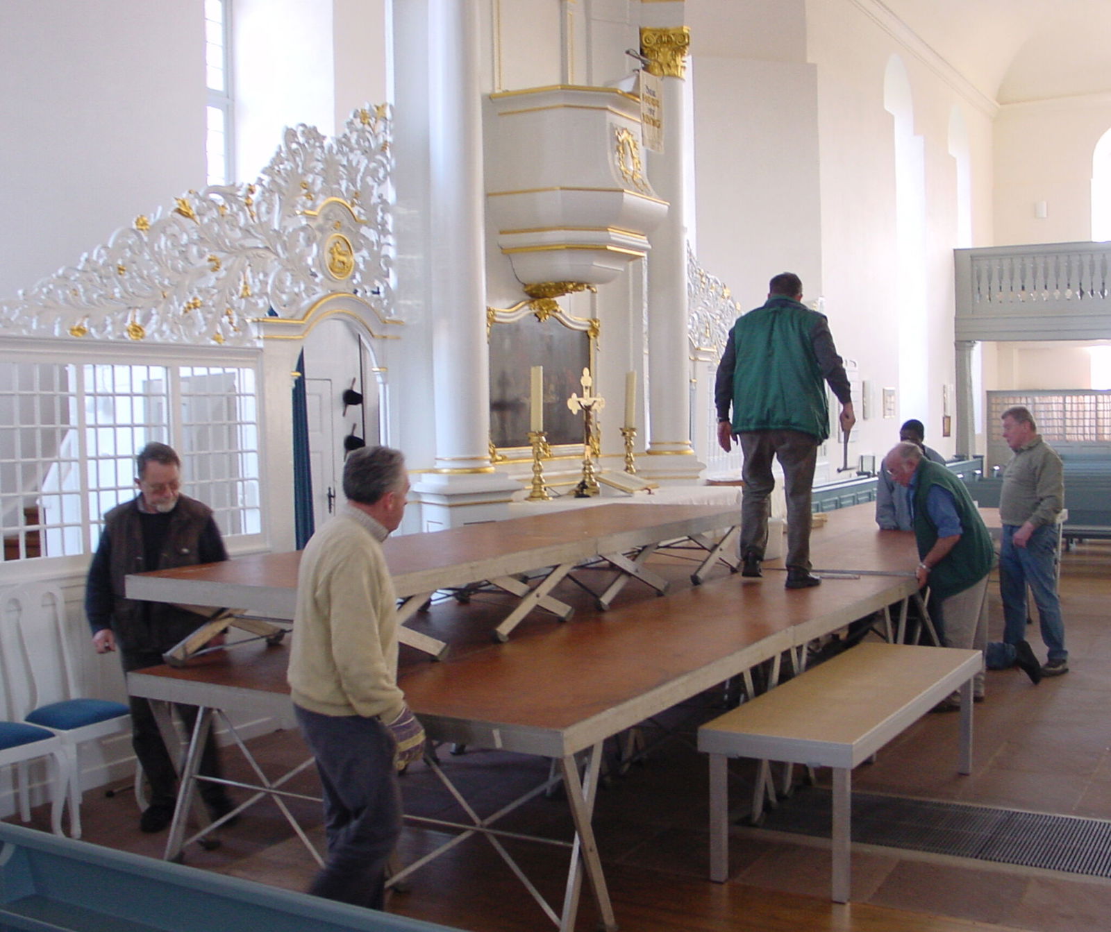 Wichtig bei den Einsätzen der Baugruppe, die in der Regel von 8.30 bis 12 Uhr arbeitet, ist das gemeinsame Frühstück um 10 Uhr. Einige ehrenamtliche Frühstücksdamen – und bei den großen Einsätzen zusätzlich auch Kirchenvorsteherinnen – bereiten es zu. Zu Beginn spricht die Pastorin ein Tischgebet. Als ein Pastor mal nicht dabei sein konnte, bestellte der „Chef“ der Baugruppe extra einen Lektor, der das Gebet anleitete. Tatsächlich ist vielen der Männer wichtig, dass sie die Arbeit bewusst für ihre Kirche tun. Die Kirchengemeinde bedankt sich mit einem gemütlichen Grillabend im Sommer, wo dann auch den Ehefrauen gezeigt wird, was ihre Männer geschafft haben.