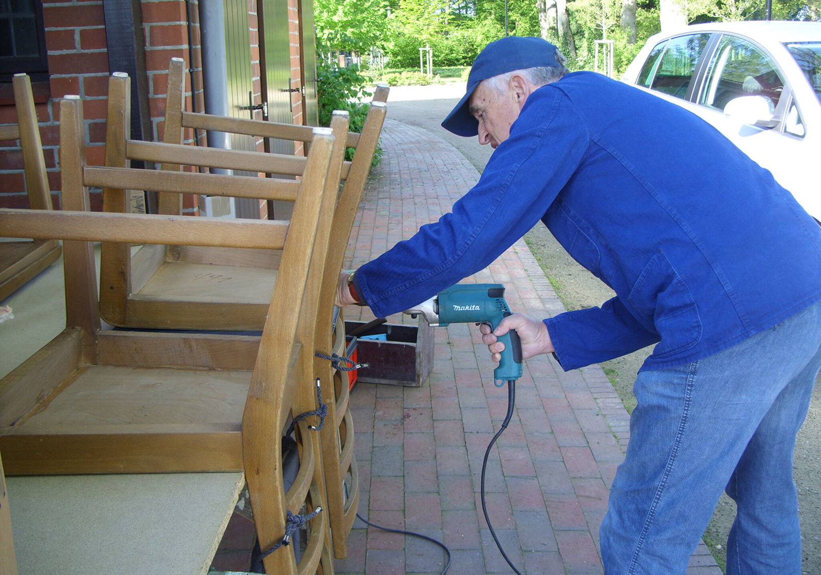 In diesem Frühjahr bekamen die Stühle in der Friedhofskapelle Halterungen für die Gesangbücher. Den Einsatz der Baugruppe plante der Tischlermeister Friedrich Free – in der Gruppe liebevoll „Chef“ genannt – genau, so dass die Aktion dann in einem Vormittag zu schaffen war: 130 Stühle wurden aus der Kapelle getragen, draußen wurden sie angebohrt und der letzte im Team setzte die neue Halterung ein, bevor der Stuhl wieder in die Kapelle geschafft wurde. Gern arbeitet die Baugruppe auch mit den örtlichen Handwerkern zusammen. So wurde in letzten Winter mit Hilfe eines Dachdeckers und seines Steigers eine große alte Kiefer auf dem Kirchhof gefällt. Alle verfügbaren Männer mussten am Seil ziehen, damit der Baum so fiel, dass keine umliegenden Pflanzen oder gar das alte Kriegerdenkmal auf dem Kirchhof zu Schaden kamen.