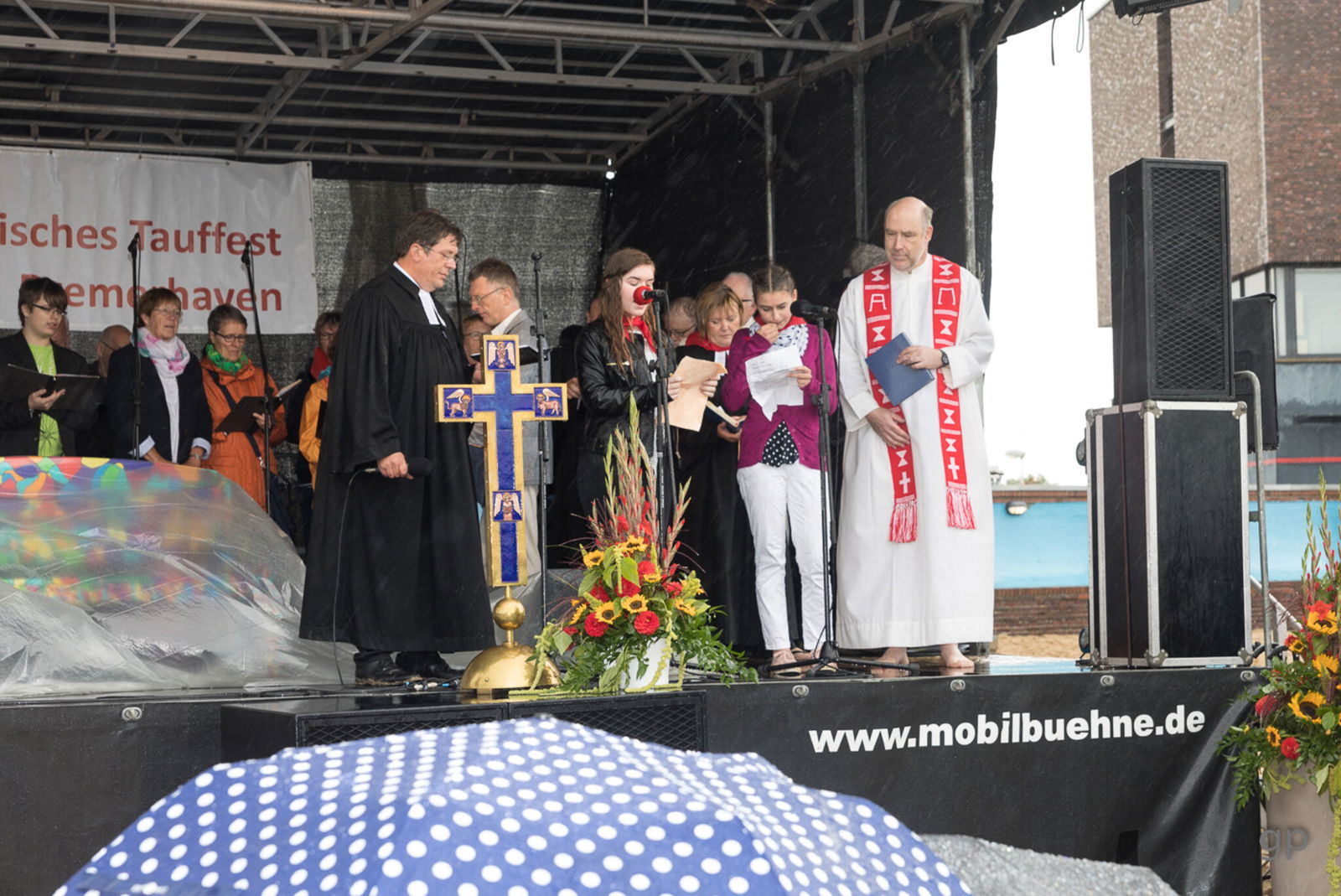 Etwa eine Stunde vor Gottesdienstbeginn setzt dann aber der Regen ein, heftig. Kurz vor 12 Uhr, der geplanten Zeit für den Beginn, gibt es noch keine Anzeichen, dass der Regen in absehbarer Zeit weniger werden würde. Das Vorbereitungsteam für den Gottesdienst beschließt daher, den Gottesdienst etwas zu kürzen und möglichst schnell mit den Taufen zu beginnen. Das geplante Anspiel, in dem ein jugendlicher Täufling sich vor der Taufe mit seinem Taufpaten unterhält, und die Geschichte vom sinkenden Petrus finden dennoch ihren Platz. Vertreter der evangelisch-lutherischen Gemeinden, der unierten Gemeinde der Großen Kirche, der evangelisch-reformierten Gemeinde und der katholischen Gemeinde in Bremerhaven, darunter Pastorinnen und Pastoren, aber auch Jugendliche, kommen im Gottesdienst zu Wort. Musikalisch begleitet wird er vom eigens für dieses Tauffest ins Leben gerufenen Projektchor unter der Leitung von Kantor Volker Nagel-Geißler.