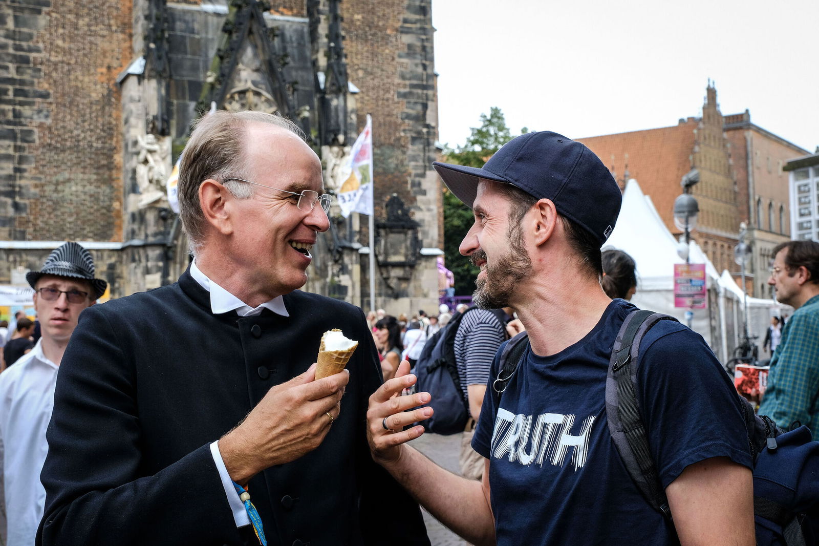 Es sei tatsächlich "Ein Fest für alle", da es keinen theologisch-protestantischen Schwerpunkt gebe, erläuterte der Bischof. "Auch unsere katholischen und muslimischen Freunde sind zu Gast." Rund um die Marktkirche informierten kirchliche Einrichtungen in weißen Pavillons über ihre Arbeit. Die Johanniter etwa präsentierten eine ihrer Rettungshundestaffeln. Die Friedensarbeit vom Haus kirchlicher Dienste zeigte eine "Crazy-Quilt", den rund 80 Beteiligte aus Fetzen einer Uniform und Botschaften zu Krieg und Frieden zusammengenäht hatten. Die Flughafenseelsorge, das diakonische Zahnmobil für Obdachlose und das Evangelische Flüchtlingsnetzwerk mit seiner fahrenden Fahrradwerkstatt waren ebenfalls vertreten.