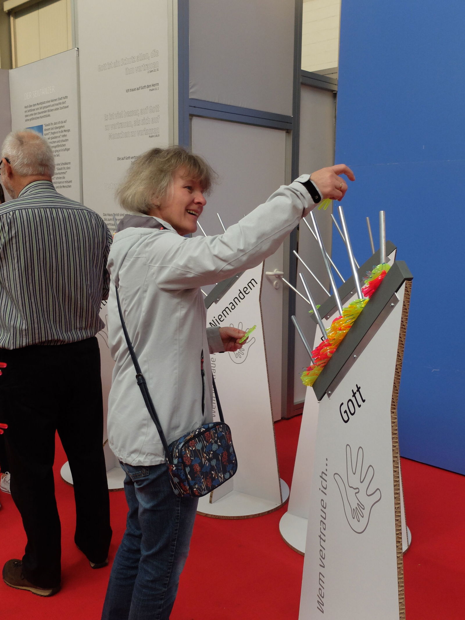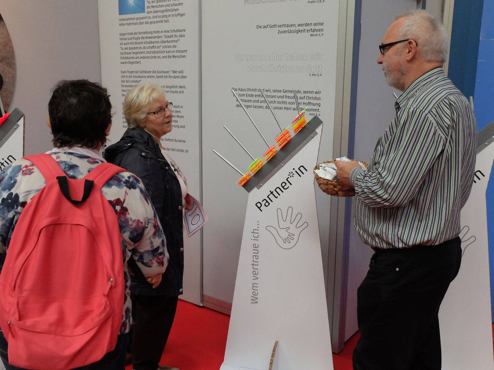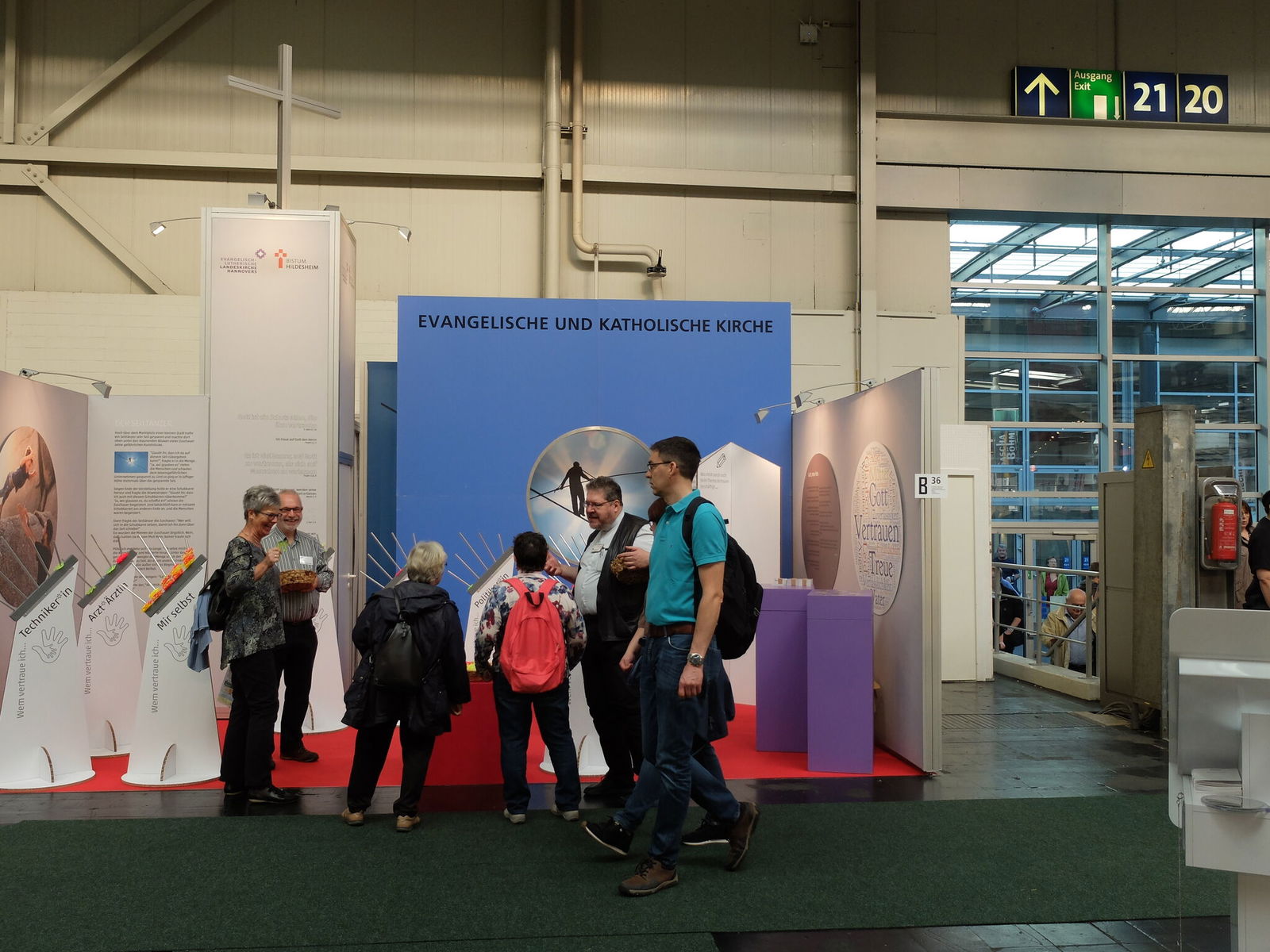 Pastor Ulrich Krämer, am ersten Tag der Messe im Dienst, erzählt, dass es diesen Stand seit mindestens 30 Jahren gibt. Und zwar von Beginn an ökumenisch. Und über die Jahre zeigt sich, dass jedes Mal etwa 5000 „qualifizierte“ Gespräche und Kontakte geschehen – wenn also Menschen mehr als einen Blick wagen und sich tatsächlich beteiligen.