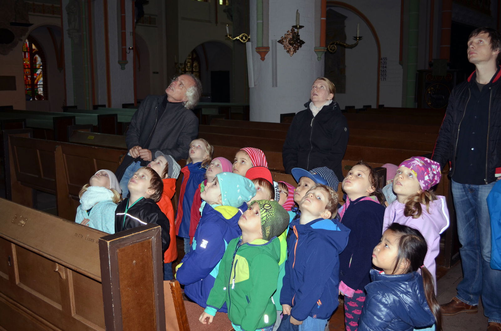 Doch zunächst müssen die Ohren warten. Vogelsänger postiert sich mit seinen jungen Gästen im Kirchenschiff und nimmt das imposante Instrument von dort aus in Augenschein. Schließlich handelt es sich nicht um irgendeine, sondern um die berühmte „Bach-Böhm“-Orgel aus dem 16. Jahrhundert. „Die ist 464 Jahre alt, so alt wird kein Mensch“, stellt Vogelsänger klar. Und er hat noch eine Zahl: Aus 3.865 Pfeifen besteht die Orgel: „Die meisten sieht man nicht, die stecken innen drin.“ Mehr als für Zahlen interessieren sich die Kinder für die vielen Figuren und prachtvollen Verzierungen. Mit gereckten Hälsen zählen sie auf, was sie sehen: Sonne, Mond und viele „Engel, die Musik machen.“ Joachim Vogelsänger erklärt: „Engel sind ganz nah bei Gott. Sie machen Musik, um Gott zu danken, dass er uns ganz toll gemacht hat.“