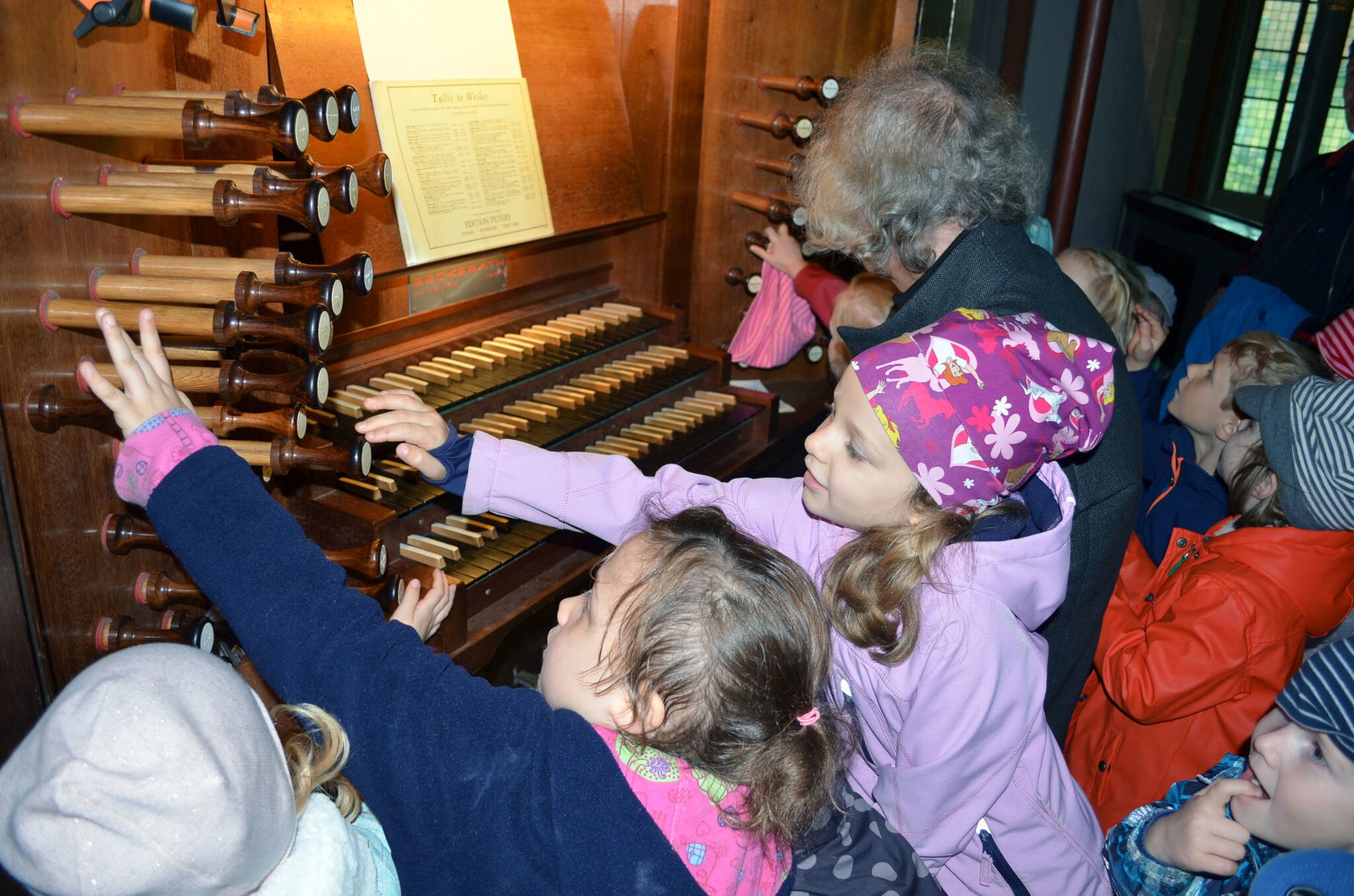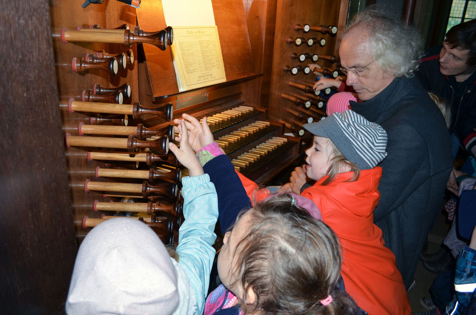 Als der Musiker auf der Orgelbank Platz nimmt und ihm die Kinder dicht auf die Pelle rücken dürfen, ist die Scheu komplett verflogen: Sie ziehen an den „dicken Knöpfen“ rechts und links und lauschen, wie sich der Klang verändert. Sie staunen, dass man auch mit den Füßen spielen kann und singen mit Orgelbegleitung „Halte zu mir, guter Gott“. „Du kannst ganz gut Orgel spielen“, attestiert Emma (5) dem Kirchenmusikdirektor zum Abschluss. Mit Emily (4) ist sie sich einig: „Orgel ist cool. Das will ich auch lernen.“