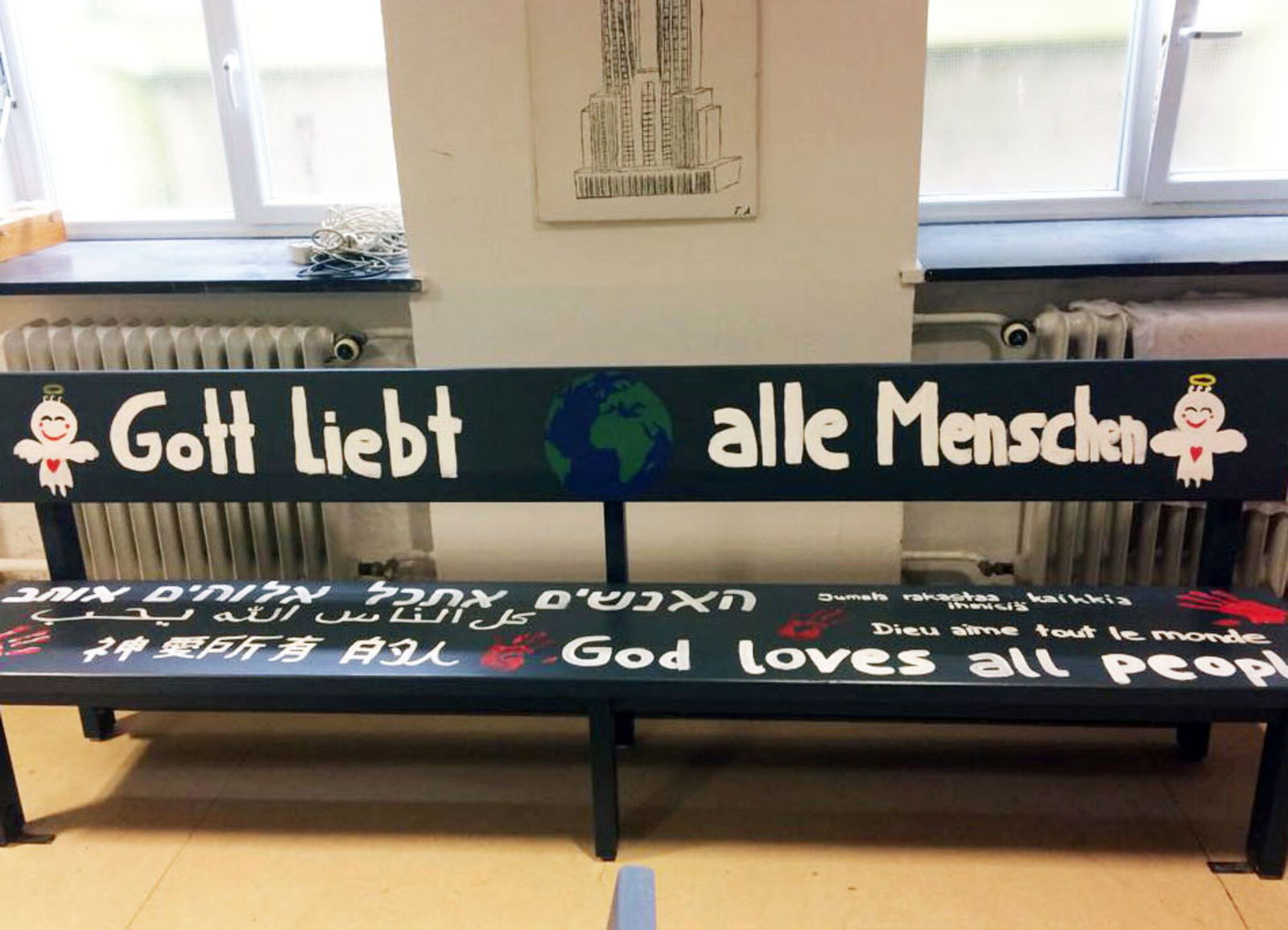 Den Gedanken von Gemeinschaft ohne Grenzen und Schranken haben auch die Kinder aus der Grundschule Alter Markt bei ihrer „Bank der Weltreligionen“ umgesetzt. Auf und an der Bank können die Gläubigen aus fünf Religionen nebeneinander beten: Katholische und evangelische Christen sind symbolisiert durch Kreuz und Lutherrose, die Juden durch den Davidstern. Neben der Kirchenbank könnten Hindus ihren Göttern Obst als Opfergaben auf kleine Tische legen, und auf der anderen Seite lädt ein kleiner Podest mit Gebetsteppich Muslime zum Beten ein.