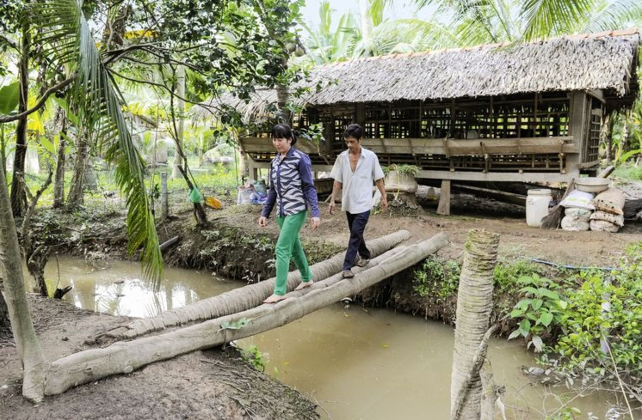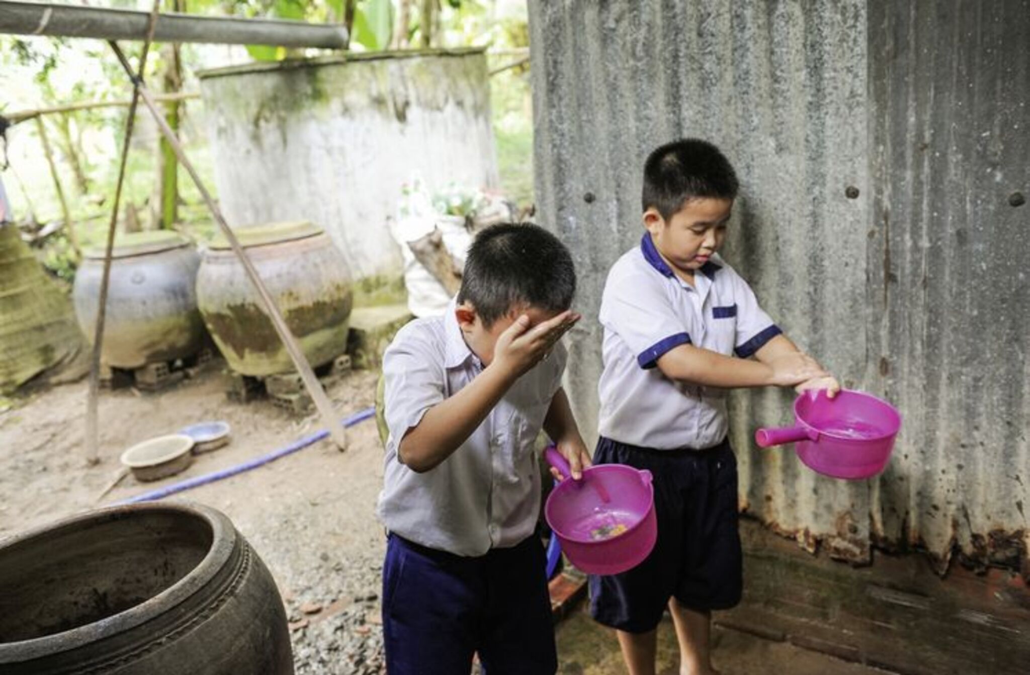 Als die Zwillinge aus der Schule kommen, lässt Lam Kim Phuong etwas Wasser in zwei rosa Plastikschüsseln laufen. „Wascht euch die Hände“, sagt sie zu den Achtjährigen, „danach gibt es Essen.“ Auf dem blanken Holztisch steht bereits dampfende Hühnersuppe, die die Mutter mit Regenwasser zubereitet hat: „Das ist viel sauberer als das Flusswasser, das wir früher zum Kochen benutzt haben“, erzählt die 37-Jährige. Sie ist heilfroh über den grauen Betontank, in dem die Familie seit 2015 Wasser zum Trinken und Kochen sammelt. „Die Kinder haben seitdem keinen Durchfall mehr“, sagt sie, „wir sind alle gesünder.“
