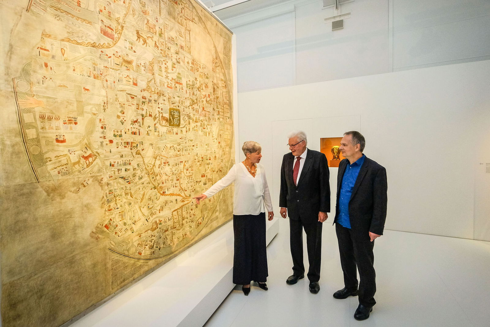 "Das sind alles Frauenorte", erläutert Museumsdirektorin Lembke. "Sie sind kaum bekannt, aber seit dem Mittelalter Orte der Bildung und des Wissens." Davon zeugt auch eine Nachbildung der berühmten Weltkarte aus dem Kloster Ebstorf bei Uelzen - das Original wurde 1943 zerstört. Eine Darstellung von Christus umspannt dabei alle damals bekannten Erdteile. "Bildung und Glaube sind im Mittelalter kein Widerspruch, sondern eine Einheit", sagt Ausstellungskurator Jens Reiche.