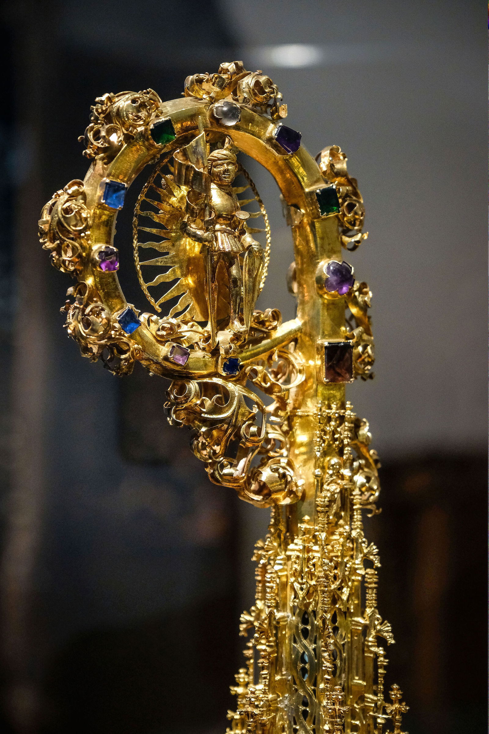 Den Führungsanspruch der Äbtissinnen der Klöster dokumentiert ein vergoldeter Äbtissinnen-Stab aus dem Kloster Medingen bei Uelzen mit emailgeschmücktem Knauf. Bei Zeremonien im Kloster wird er bis heute benutzt. Neben kleinen Klosterschätzen wie der Brille stehen große wie ein "Propststuhl" aus dem Kloster Lüne in Lüneburg oder ein Äbtissinnen-Stuhl aus dem Kloster Wienhausen. Eine lebensgroße Statue zeigt die Gründerin des Wienhausener Klosters, die 1266 gestorbene Agnes von Landsberg. Die Steinskulptur ist mit rund 370 Kilogramm das schwerste Kunstwerk der Ausstellung.