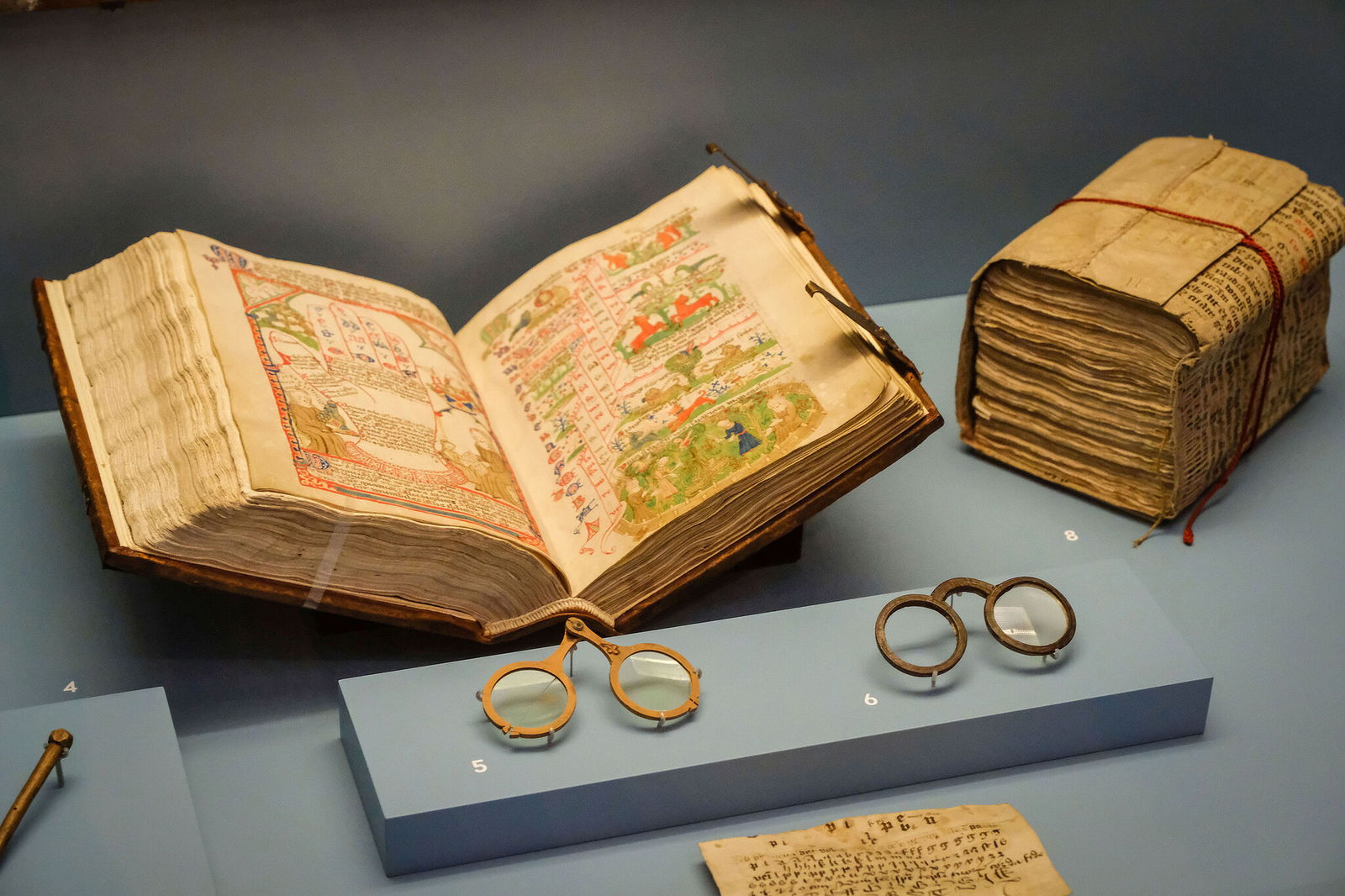 Die Gläser sind schon etwas zerkratzt, aber sonst ist das Gerät noch in gutem Zustand. Die älteste Brille der Welt, eine Nietbrille aus Buchsbaumholz, bringt es auf 3,4 Dioptrien, war also für Weitsichtige gedacht. Eine Nonne hatte sie im 14. Jahrhundert im Chorgestühl des Klosters Wienhausen bei Celle versteckt - 1953 wurde sie dort bei Renovierungsarbeiten in einer Ritze gefunden.